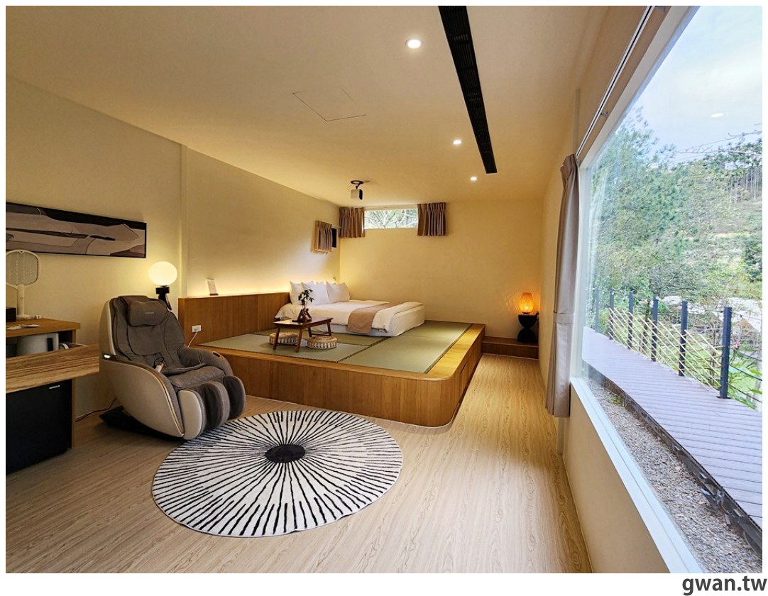 另一間四人房看起來更厲害了,空間超大,戶外視野也非常棒,讓你躺在床上就能飽覽森林美景!而且一打開門房間裡面就香香的,很舒服的味道