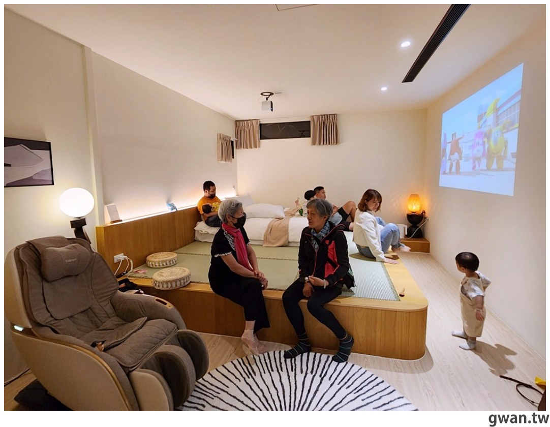房間內居然還有按摩椅,讓我們眼睛都亮起來,想像晚上邊看電視邊按摩的畫面,簡直太享受了吧
