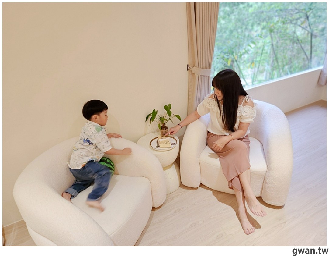 跟兒子在小沙發上享用民美味下午茶,後方通透的視野讓心情也變得開闊