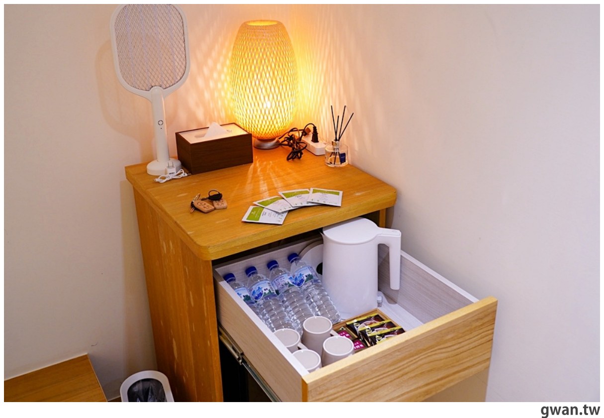 看到電蚊拍覺得好意外,但也感受到民宿主人的貼心,房間裡還有minibar,準備了好喝的日月潭紅茶,礦泉水和快煮壺一應俱全!假使礦泉水不夠喝,櫃檯跟溫室餐廳旁都有冰溫熱開飲機可使用,如果你真的很懶不想動,還可以直接請櫃台幫你多送幾瓶過來