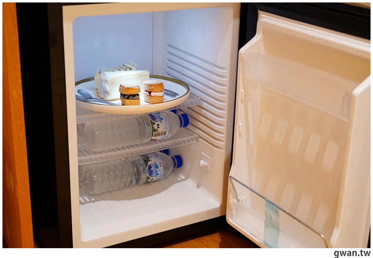 冰箱一打開,裡面有和菓森林的甜點當作迎賓點心,礦泉水也提前幫客人冰鎮,一入住就能享用美味下午茶