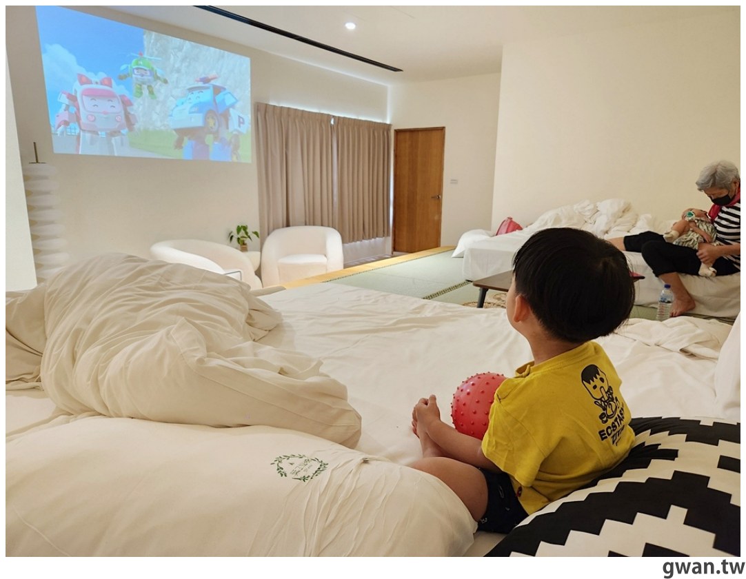 房間裡都有投影機,大螢幕看起來好爽啊!平常沒時間追劇看電視,來到這裡可以好好放鬆一下,小朋友要看卡通也沒問題