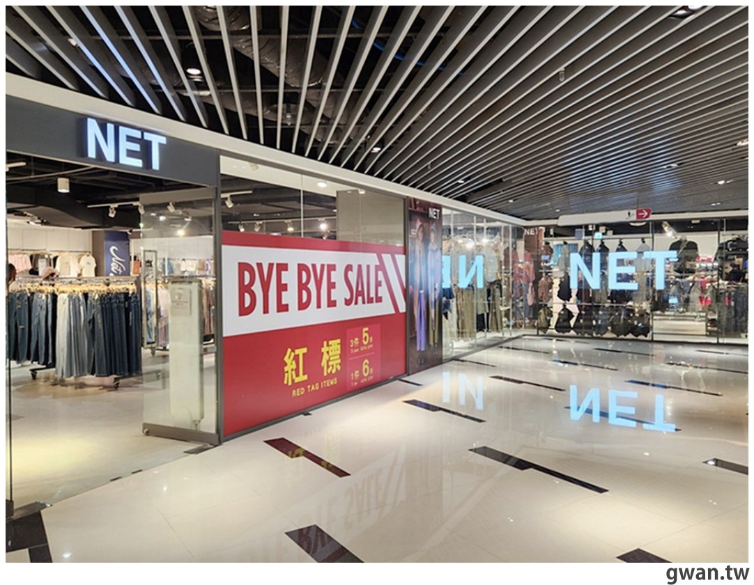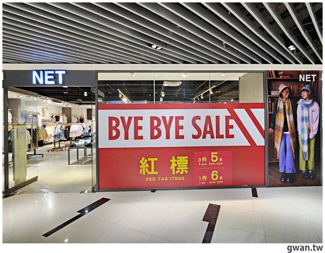 新時代百貨的NET門市位在3樓,原本聽到特價出清的消息,我也跑來撿便宜!但店外BYE BYE SALE卻寫著紅標一件6折、三件5折,跟其他門市相同的優惠讓我有點疑惑?