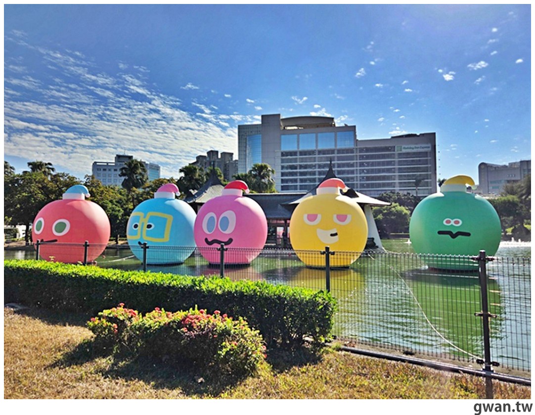 五公仔球球設置在台中公園湖心亭,從公園路騎過來就能看到公園裡的五顆大球球!我是從光復國小對面、平等街這個入口進來,很快就能找到球球們
