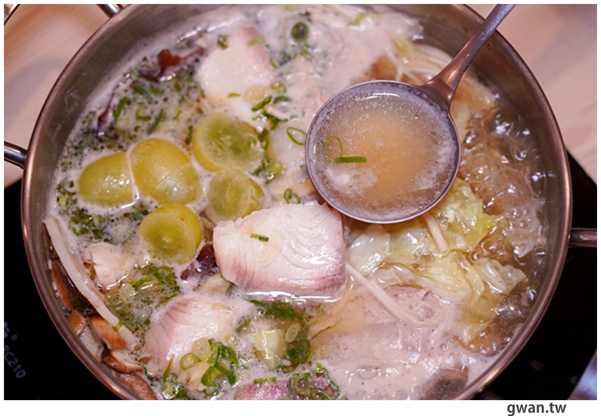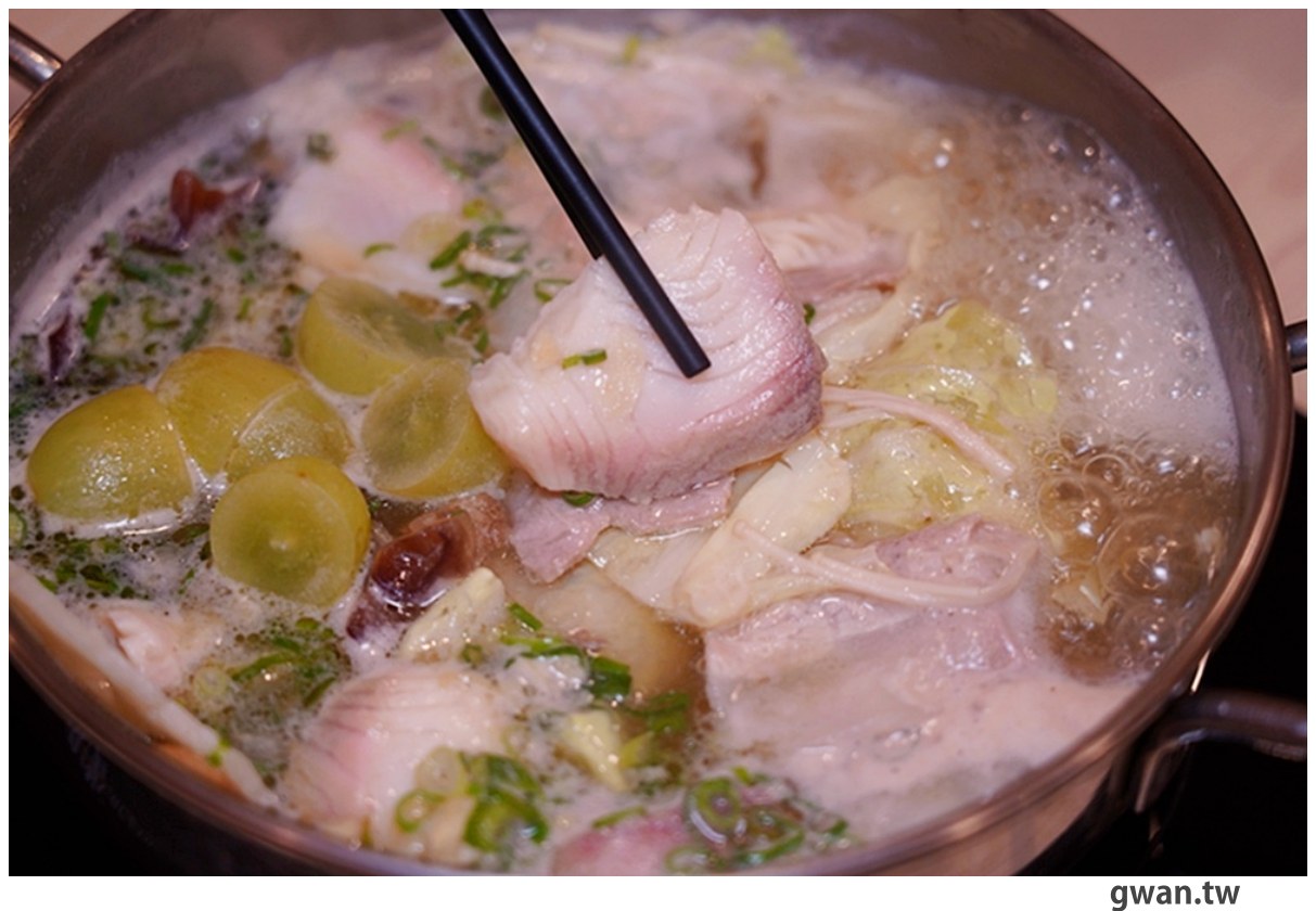 如果你是喜歡嚐鮮,又對清爽系湯頭情有獨鍾的吃貨,那就得試試這鍋綠葡萄蔬果湯!光是鍋裡一顆顆的綠葡萄,視覺效果就超吸睛!我們這鍋點的主餐是鯛魚,份量給得很滿意