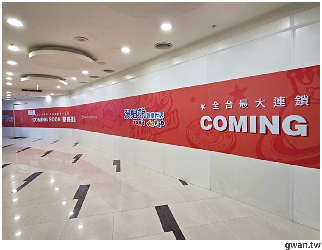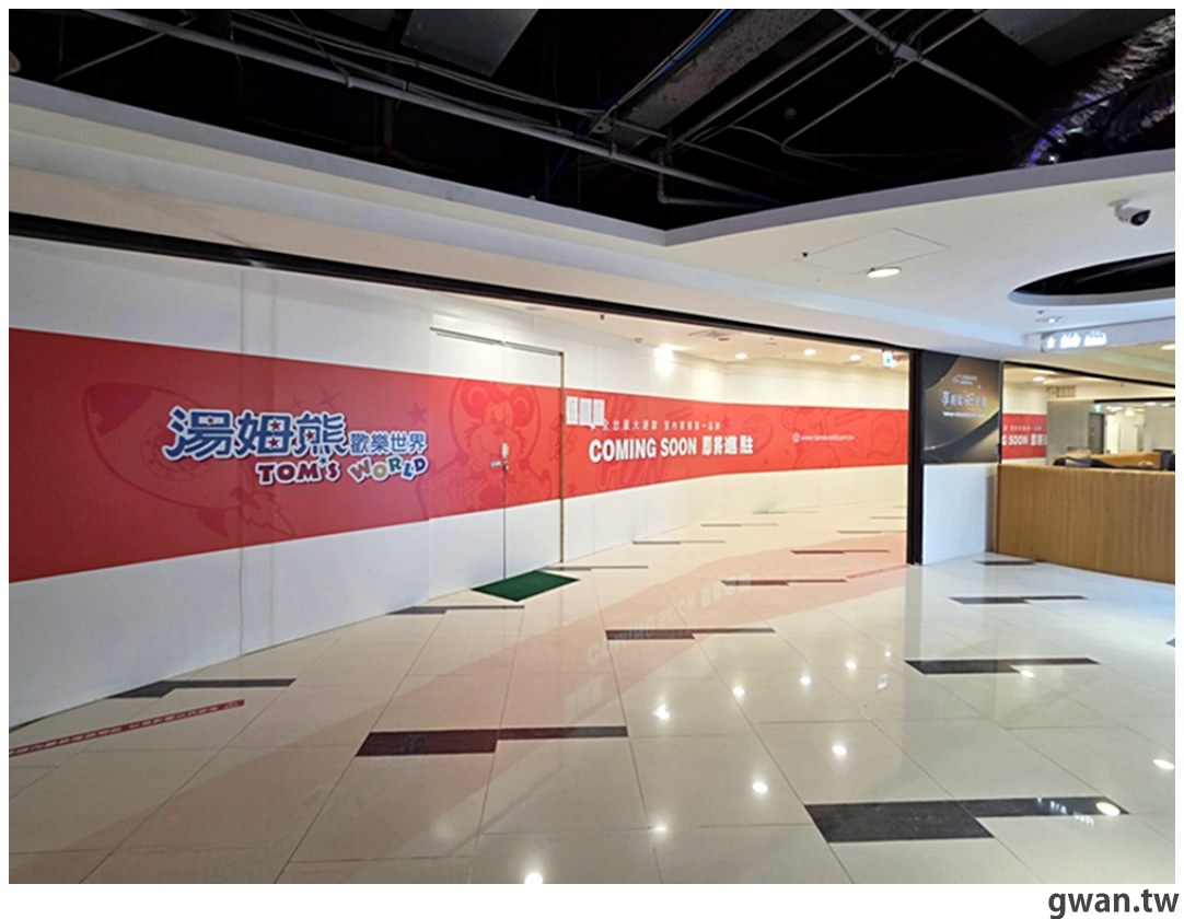 雖然粉絲團有公佈湯姆熊即將進駐,但沒有說明確切位置!我們從6、7F遊樂性質比較高的樓層一路逛上去,終於在10F發現它的身影!搭手扶梯到10F後,一眼就能看到整面紅色的『湯姆熊歡樂世界 COMING SOON』字眼