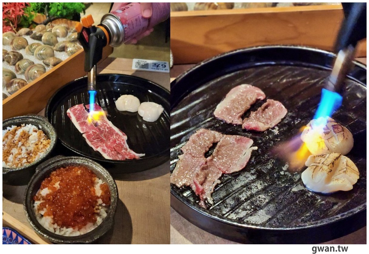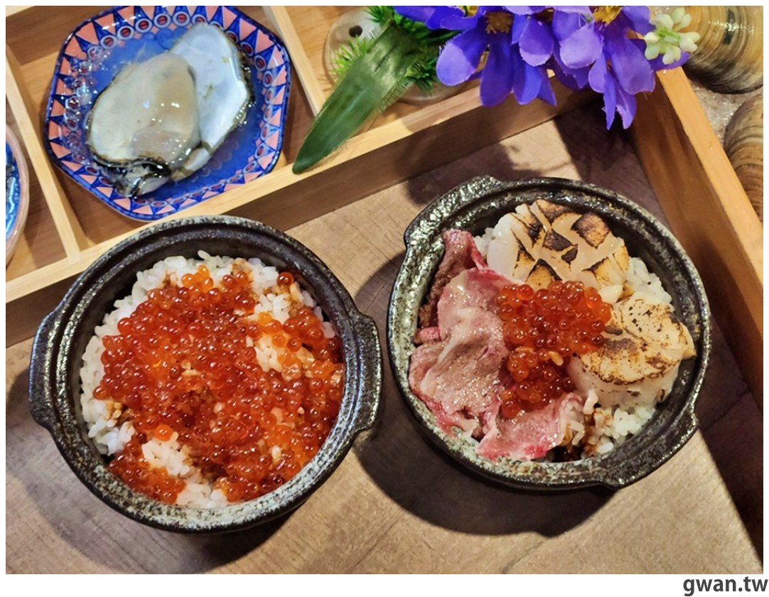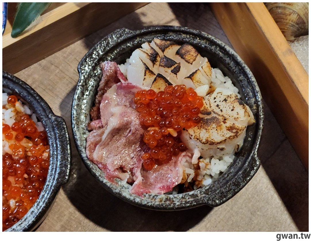 每一碗都有兩顆生食干貝以及牛小排,炙燒過充滿香氣,搭配底下的豬油拌飯吃起來超香,還有鮭魚卵在嘴裡嗶嗶啵啵爆開的口感,真的好好吃
