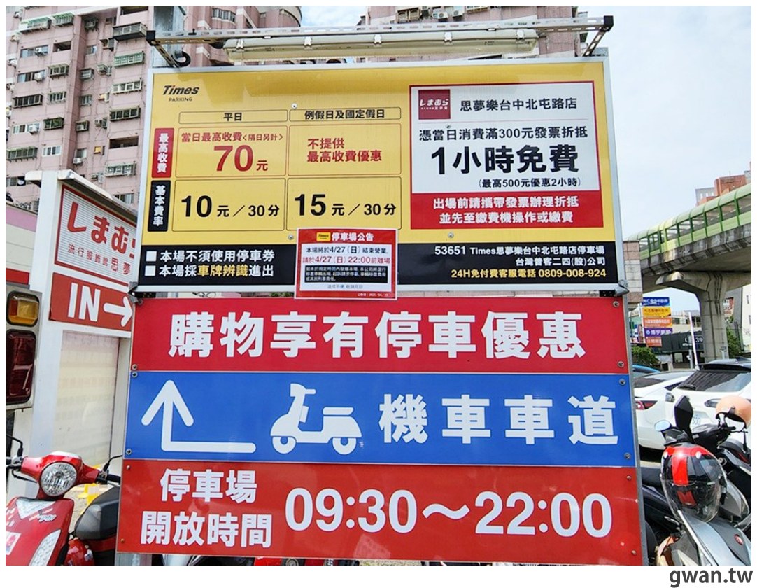只要於思夢樂台中北屯路店,憑當日消費滿300元發票即可折抵1小時停車費,滿500元最多折抵2小時