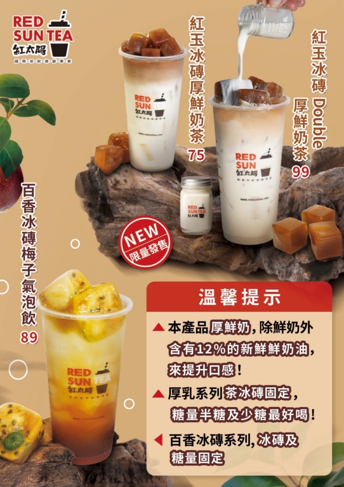 紅太陽終於來台中啦!回歸後第一間門市開在南屯殼老爹隔壁,而且跟UG Tea一樣,一次要開兩間喔,第二間則開在東海商圈!以前對紅太陽的印象就是台南的飲料店,但對這間店印象深刻是從他們家出了巨無霸多多瓶,搭配飲料真是太可愛了!然後還有巨無霸珍奶都很深植人心啊,可惜台中都沒有紅太陽,想要跟風一下都沒辦法(笑~)