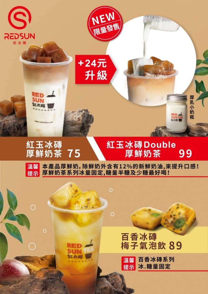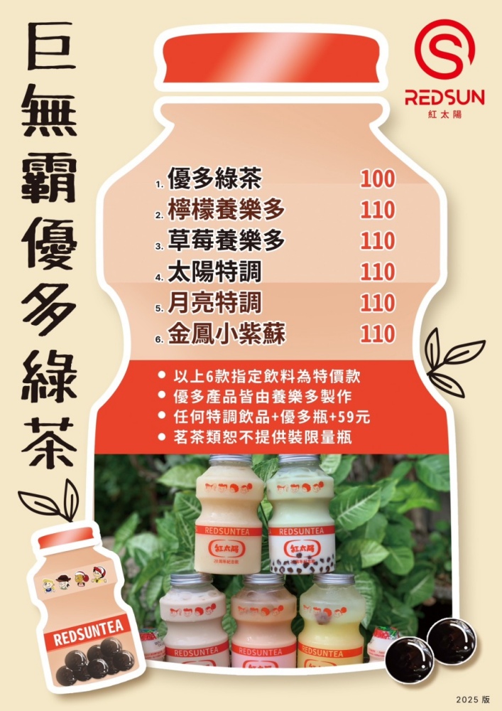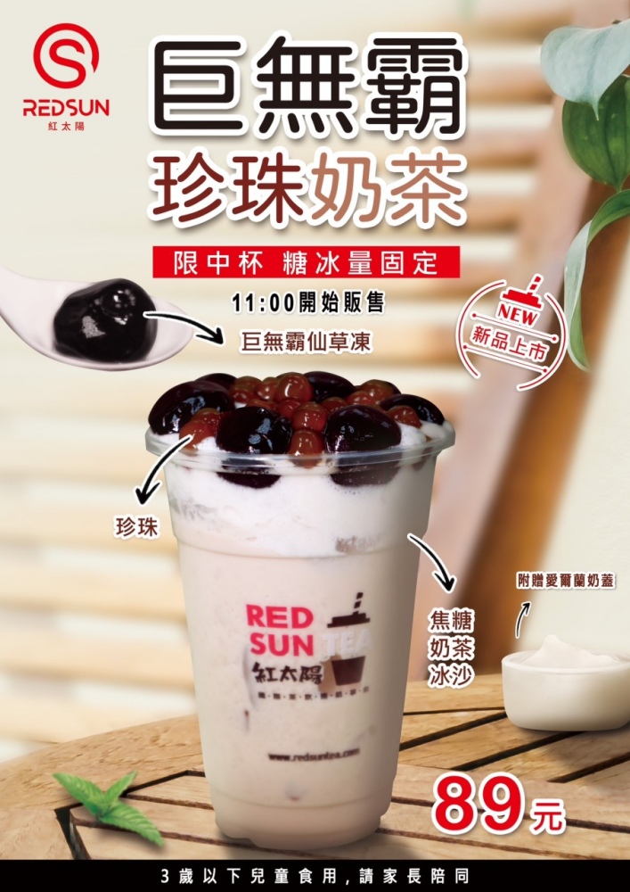 紅太陽終於來台中啦!回歸後第一間門市開在南屯殼老爹隔壁,而且跟UG Tea一樣,一次要開兩間喔,第二間則開在東海商圈!以前對紅太陽的印象就是台南的飲料店,但對這間店印象深刻是從他們家出了巨無霸多多瓶,搭配飲料真是太可愛了!然後還有巨無霸珍奶都很深植人心啊,可惜台中都沒有紅太陽,想要跟風一下都沒辦法(笑~)