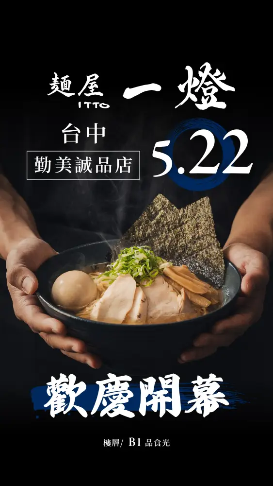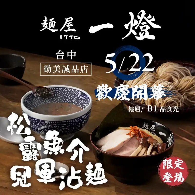 東京拉麵之王『麵屋一燈』插旗台中!官方已經公告,將於5/22盛大開幕,這次還帶來台中限定的松露魚介冠軍沾麵,全台唯一,只有台中吃得到喔!開幕當天社長也會親臨台中勤美誠品店跟現場民眾做互動,還有一系列的開幕限定活動,喜歡拉麵的朋友們快筆記下來囉~