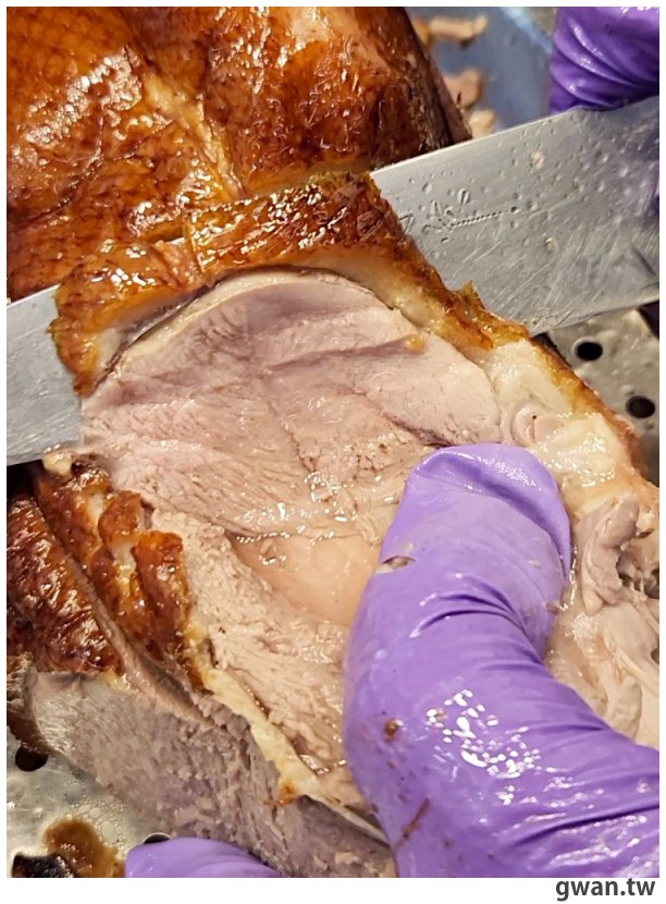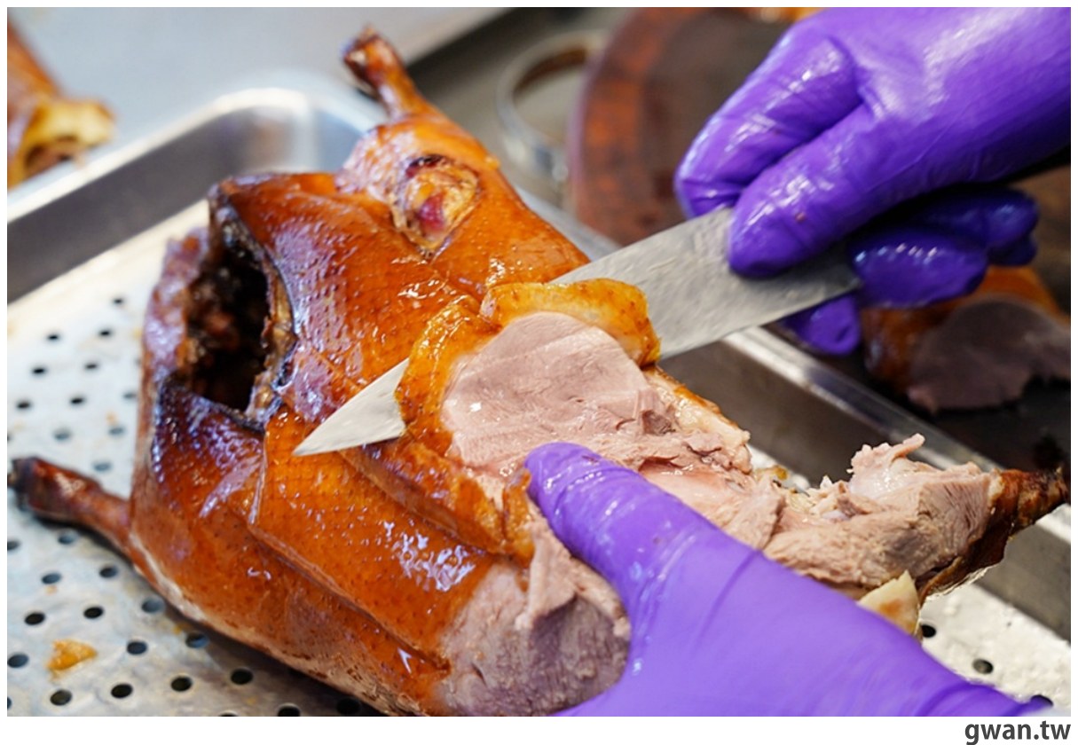 剛出爐的油亮色澤,光用看的就讓人流口水,不過還要稍微放涼一下,才會呈現烤鴨外脆內多汁的絕佳口感