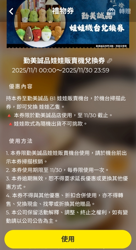 兌換券使用方式給你們參考,按下使用就會出現兌換QR code,再去機台掃描就會直接出娃娃了