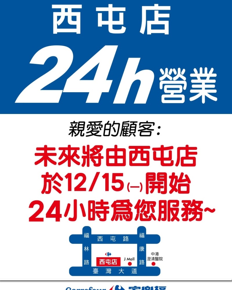 台中24小時家樂福換這間,西屯店12/15起營業不打烊~