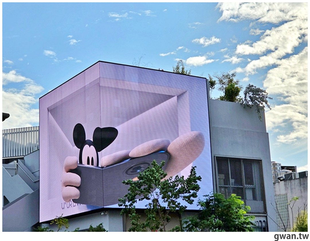 不過實際在現場看,不知道是因為螢幕太小,還是電線杆跟樹木擋到的問題,覺得立體感沒有網路上看到的這麼誇張!但米奇本人還是很可愛,會讓人想停下來欣賞一下