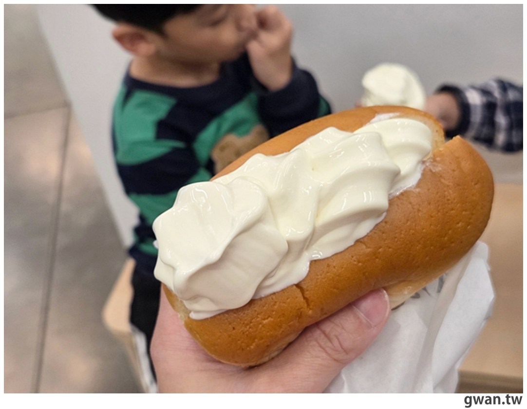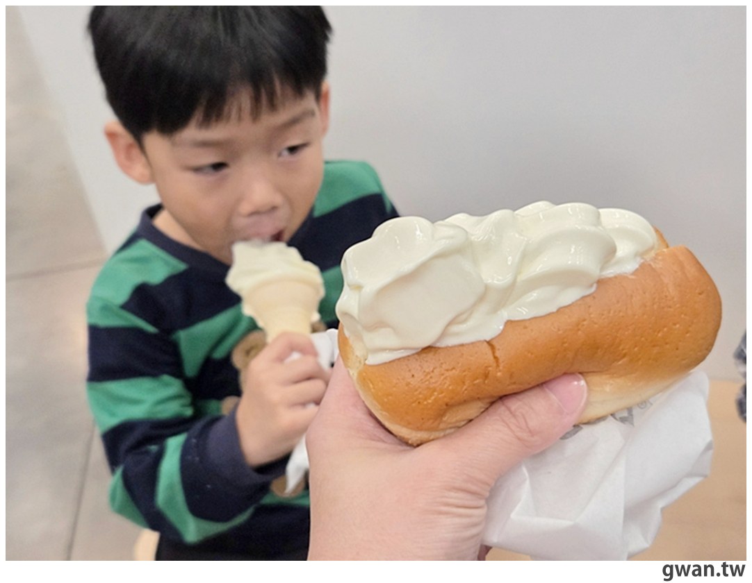 冰狗顧名思義就是把冰冰涼涼的霜淇淋夾進溫熱的熱狗麵包裡!一口咬下是冷熱交錯的奇妙口感,熱狗麵包口感蠻Q彈的,是好吃的麵包,而且我覺得霜淇淋份量還比單點甜筒來得多,這樣一份25元真的很佛心耶