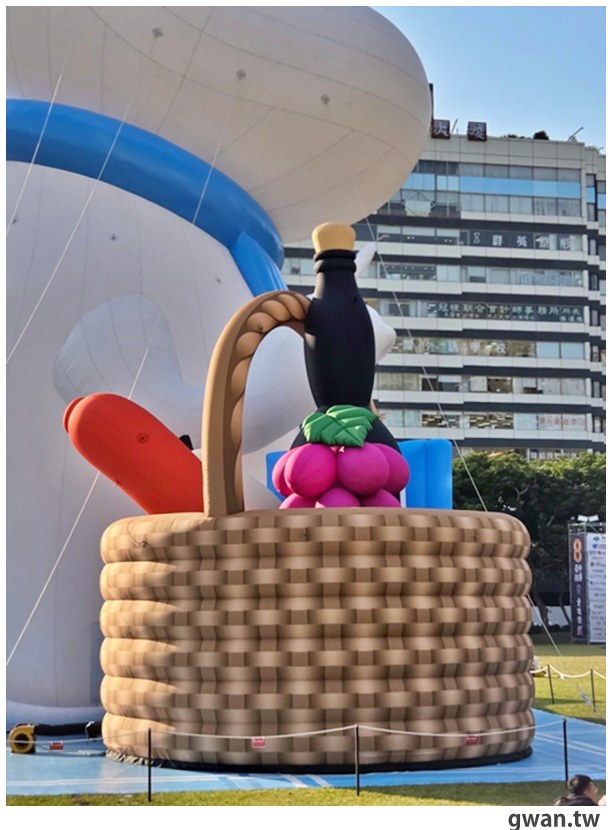 這次勤美佈置走野餐主題,現場氛圍很有生活感,嚕嚕米身旁擺了一個野餐籃,裡面裝滿香腸、水果和美酒,隨時準備好要來場浪漫的微醺時光。那天去拍照時,也看到不少人直接在姆明旁邊鋪起野餐墊,聊天、拍照、曬太陽,整個市民廣場都瀰漫著一種輕鬆又浪漫的氛圍