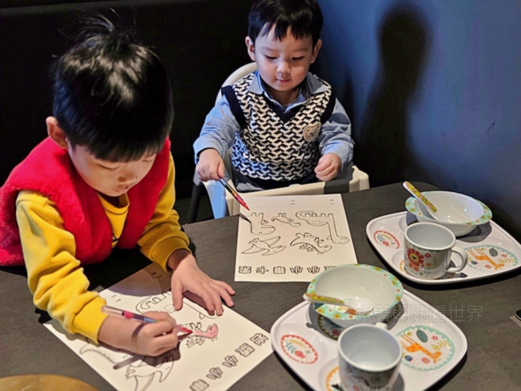 這裡對親子族群也非常友善,店家不僅準備了兒童椅和可愛餐具,孩子一入座就會送上畫紙跟蠟筆,讓小朋友專注在畫畫的世界裡,大人也能趁機享受美食,用餐後還能直接把蠟筆帶回家