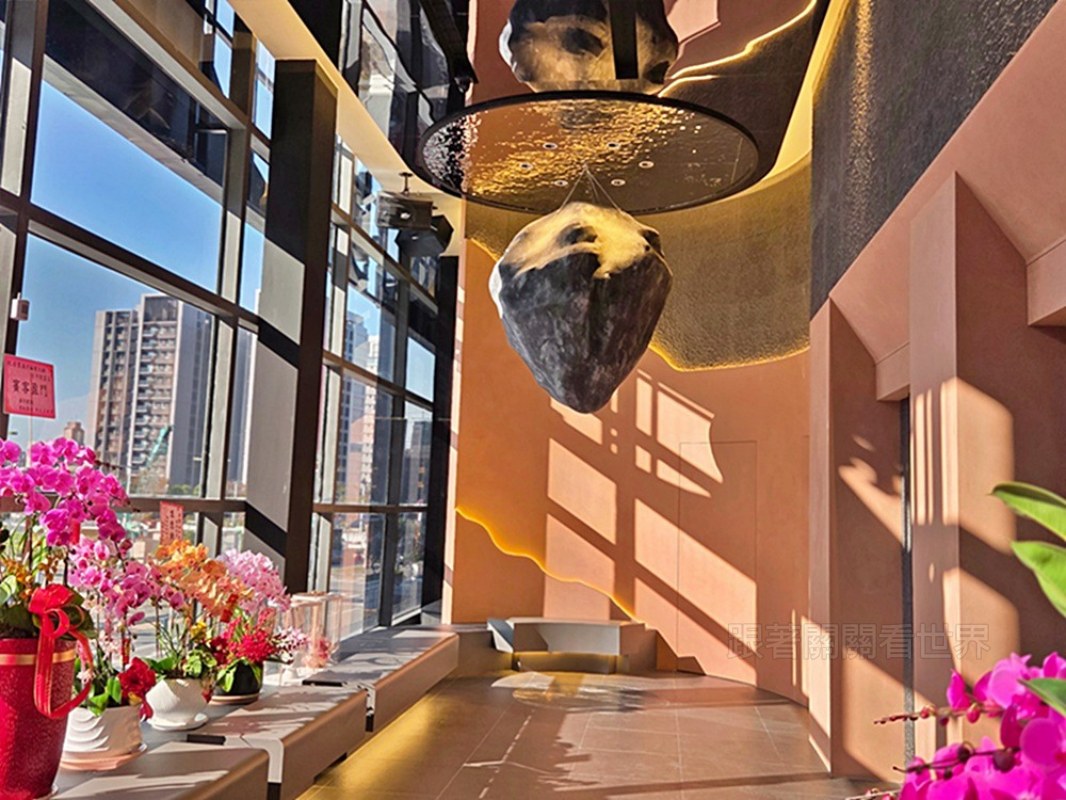 二樓大廳是挑高設計,大片落地窗當陽光自然灑入變得明亮又通透,還能一覽北屯總站附近的城市景觀!最吸睛的莫過於懸吊在天花板的岩石裝置,搭配流線型燈光勾勒出岩漿緩緩流動的痕跡