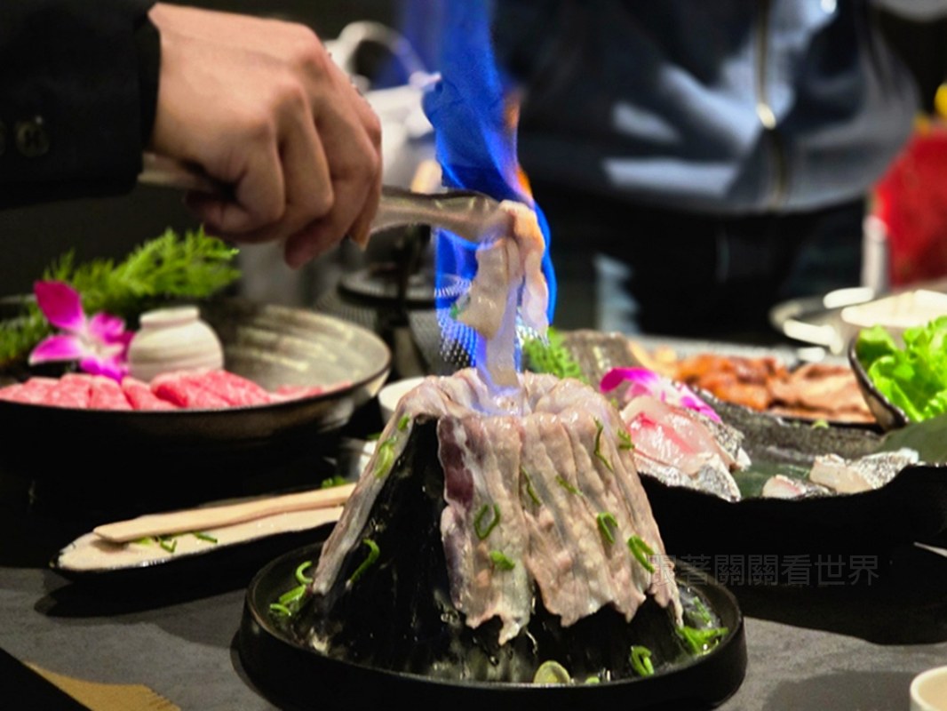 來岩漿火鍋絕對不能錯過最有儀式感的「火焰炙燒豬」,現在只要出示文章就能免費兌換!選用台灣本島豬五花,整齊排成像火山一樣的造型,在火山口倒入 58 度高粱酒並由店員桌邊點火炙燒,瞬間升起的藍色火焰,簡直像在看一場華麗的桌邊秀!