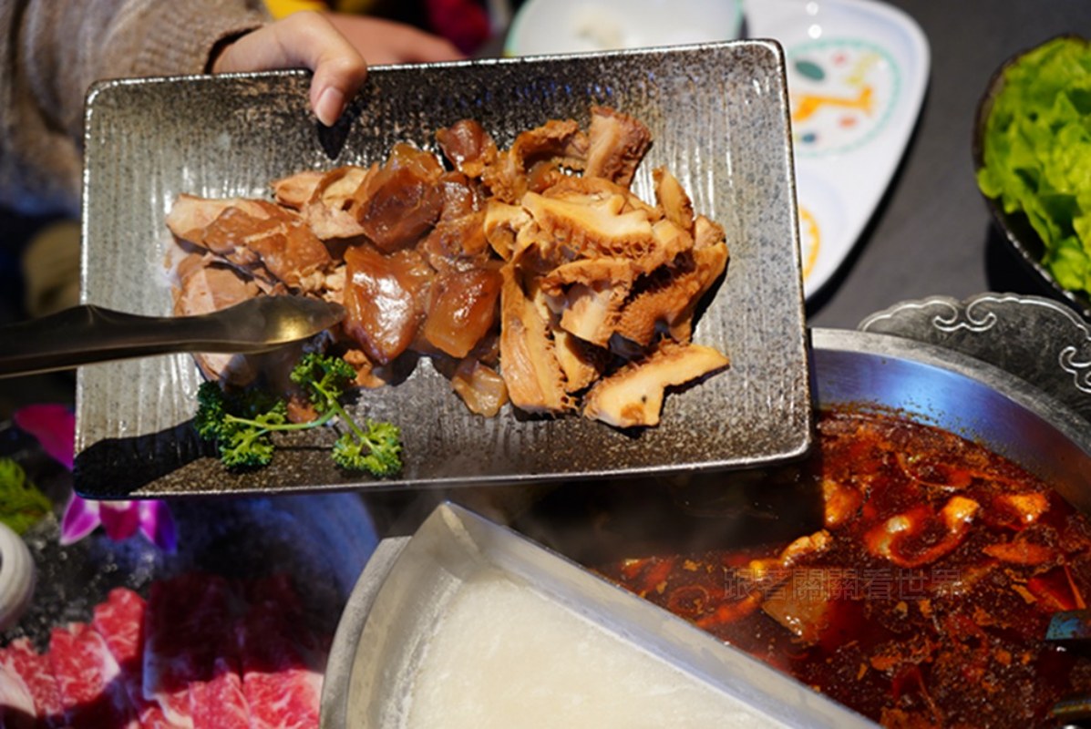 吃麻辣鍋不能缺少的就是「祕滷三寶拼盤」!一次吃到牛肚、牛筋和大腸,雖然送上桌時已經是熟食,但丟進麻辣鍋裡煮過口感更升級,每一樣都變得軟軟 QQ 的,膠質感更明顯