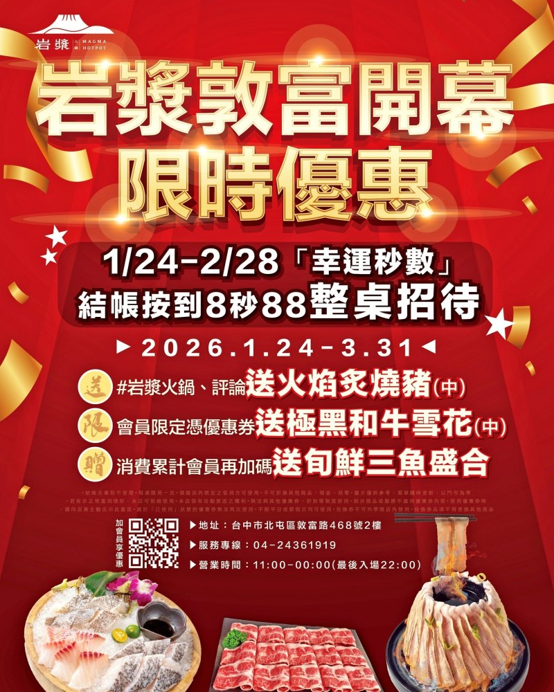 想趁開幕衝一波北屯岩漿火鍋的朋友,一定不能錯過這些超狂優惠!即日起~ 2/28開幕期間,結帳挑戰按到 8.88 秒就直接由老闆買單,就算沒按中,加入會員、壽星生日或出示文章,還會送出超多好禮