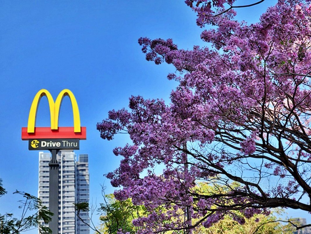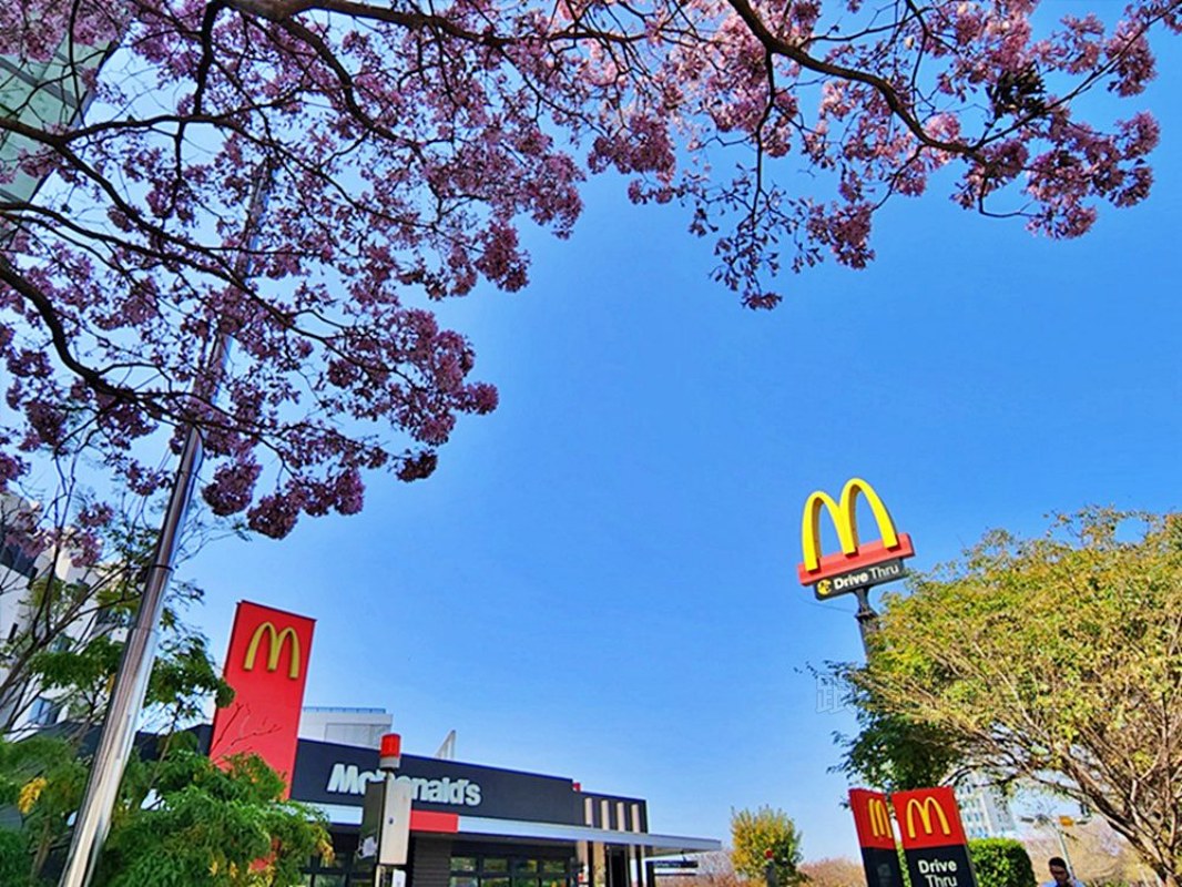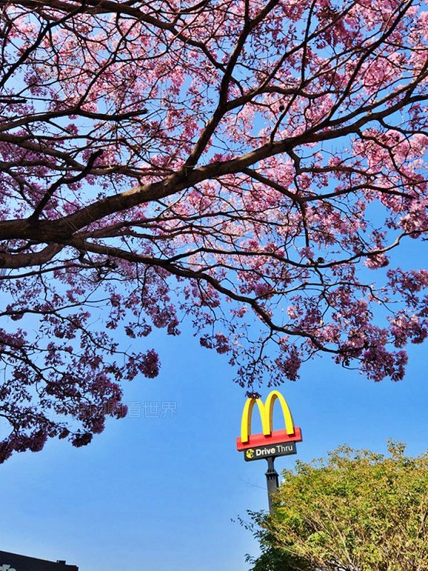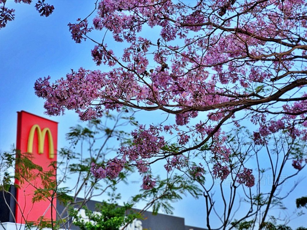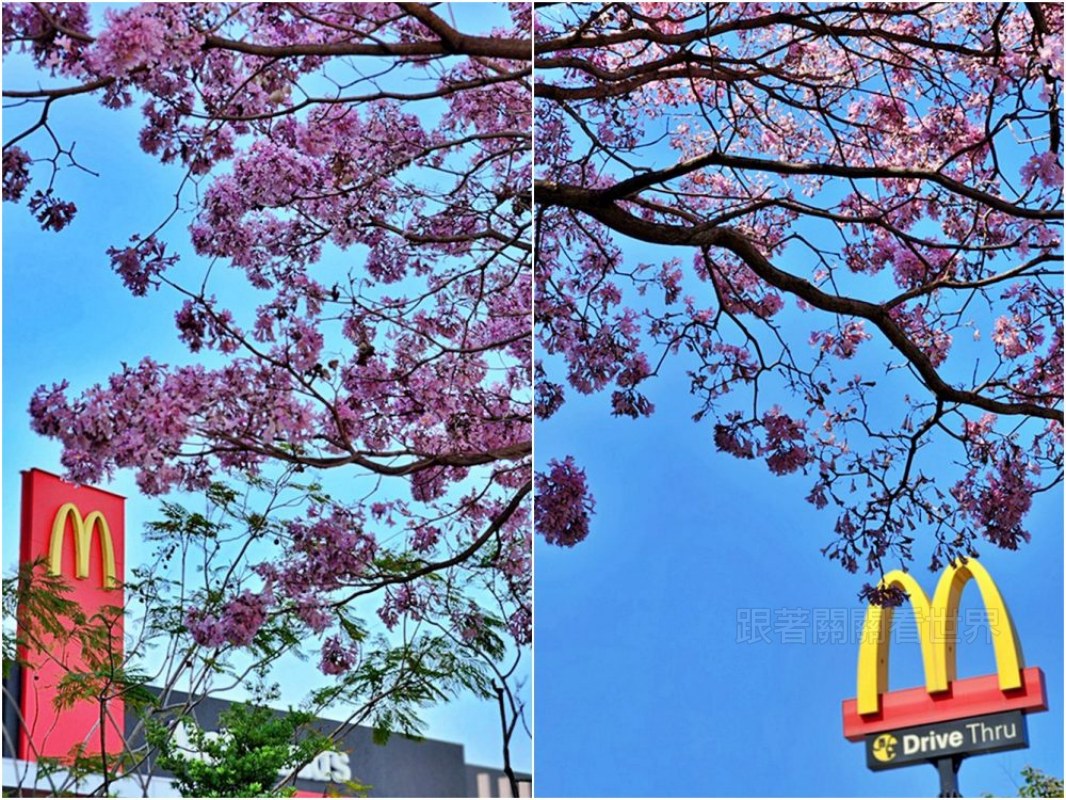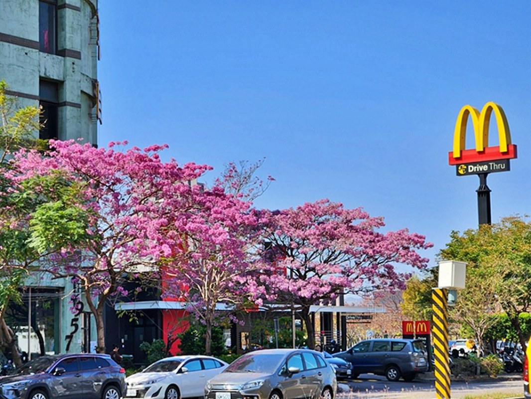 必須老實說一句,如果你是抱著「被粉紅花海包圍的麥當勞」而來,現場可能會有點失望。原本腦海中想像的是那種被漫天粉紅包圍的夢幻畫面,實際抵達才發現,主角只有路邊的兩棵粉紅風鈴木,我還一度懷疑自己跑錯地方了XD