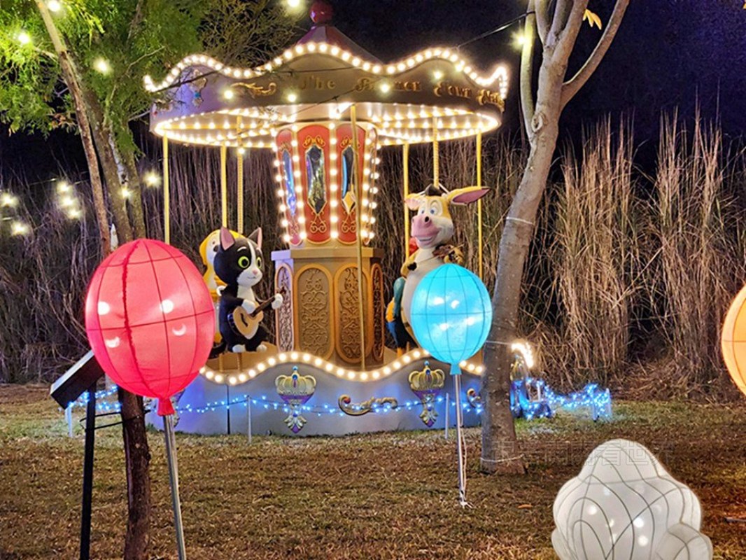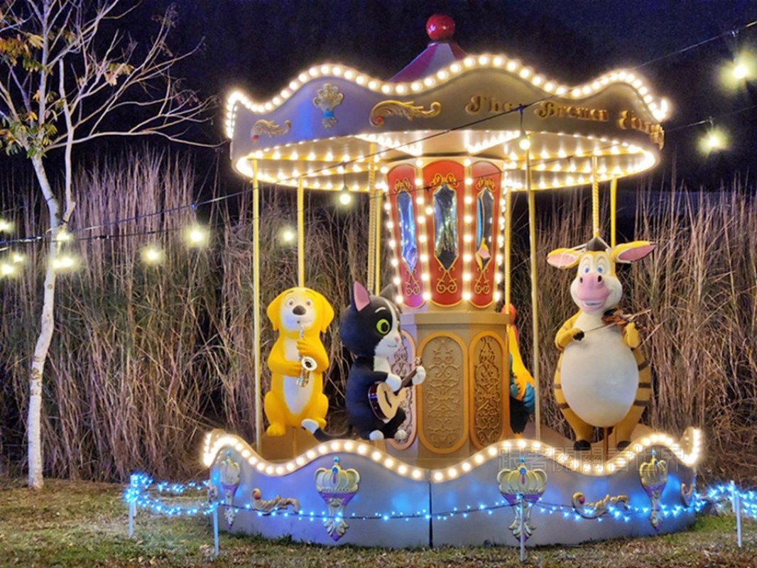 公雞、貓咪、狗狗和驢子組成的團體,不只聯手擊退強盜,還在田野間化身城市樂手,在閃閃發光的燈影中演奏著歡快旋律!讓人忍不住想跟著節奏轉圈、輕輕晃動身體,這區也是超夯打卡點,路過記得停下腳步,加入這場歡騰的森林演奏會