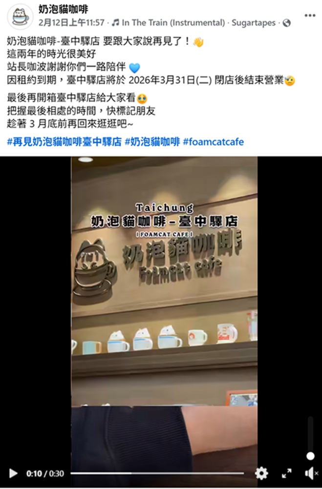 奶泡貓咖啡臺中驛店營業到什麼時候?