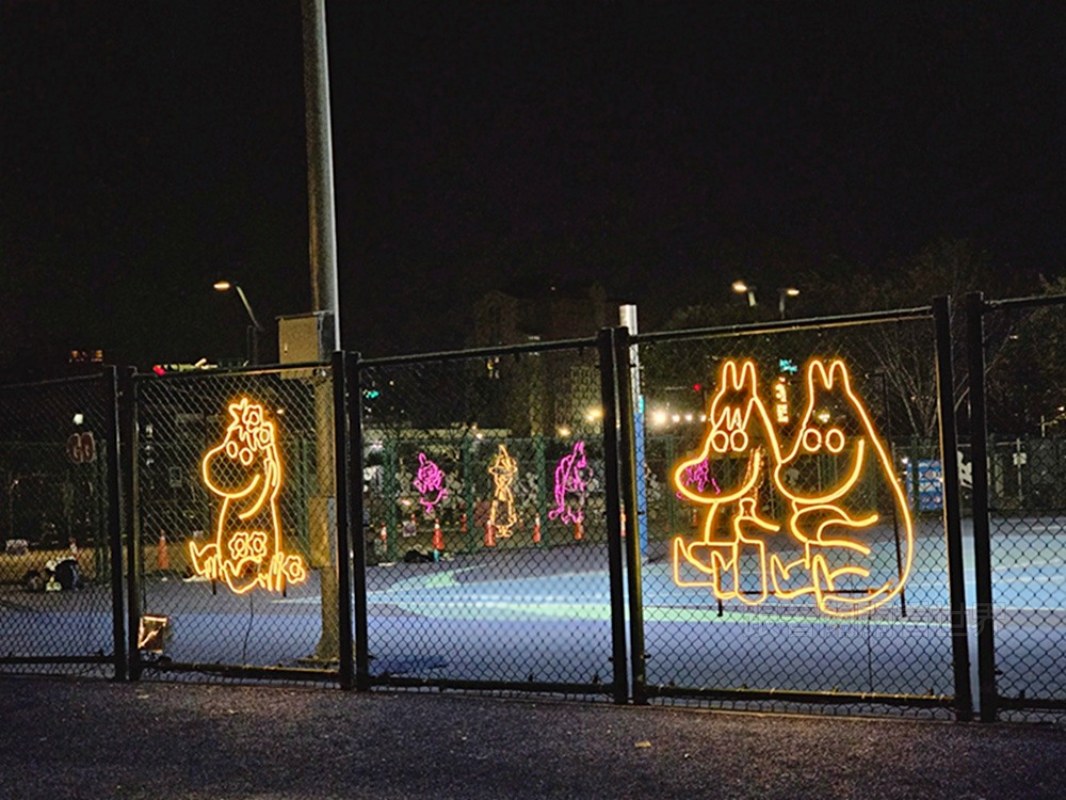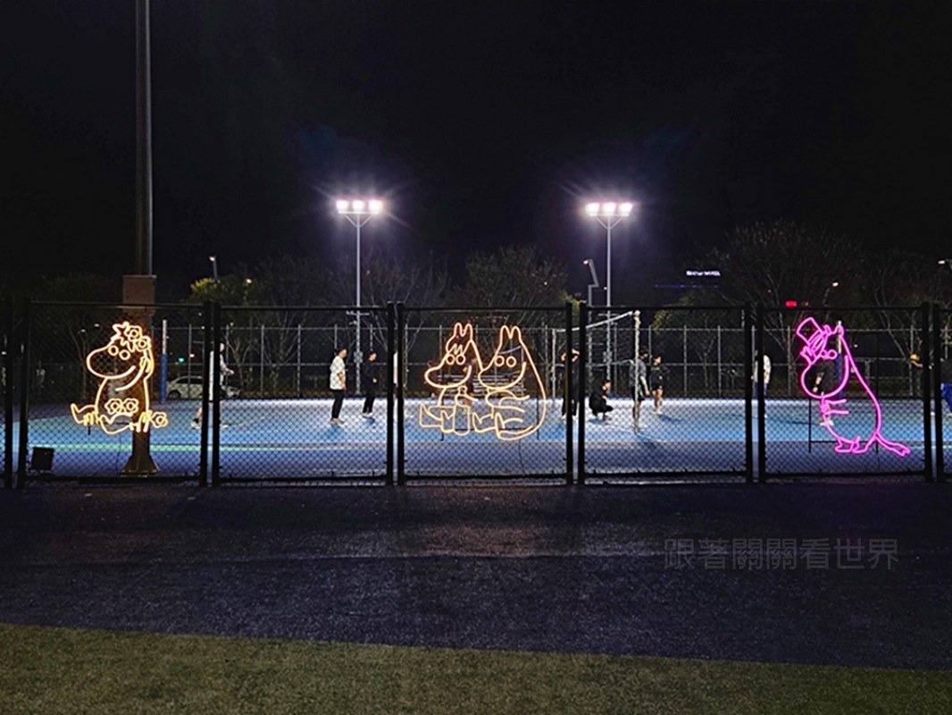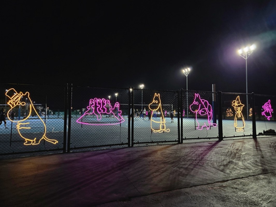 今年中央球場以「姆明愛運動」為主題打造燈飾裝置,沿著球場圍網,可以看到不同的姆明家族成員,夜晚亮燈後,粉嫩燈光在黑夜中特別顯眼