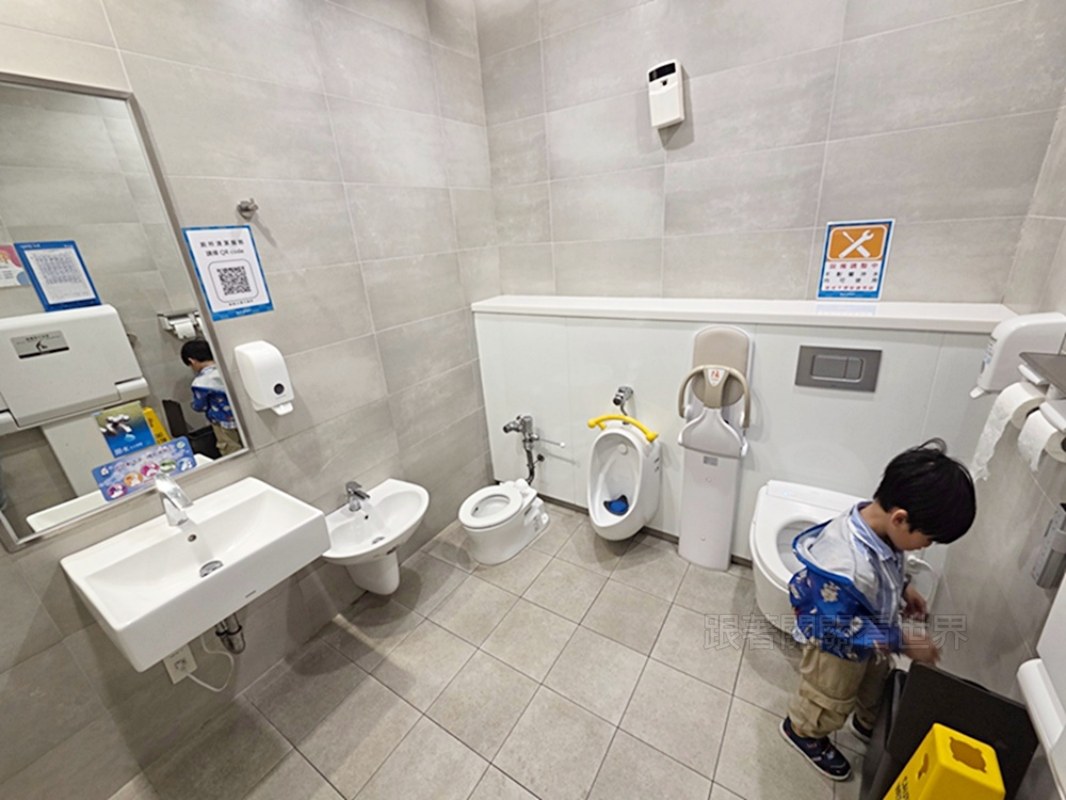 • 專屬兒童設備: 裡面配置了小朋友專用的小馬桶、小小便斗,甚至還有高度剛好的小洗手台,讓孩子可以自己如廁跟洗手