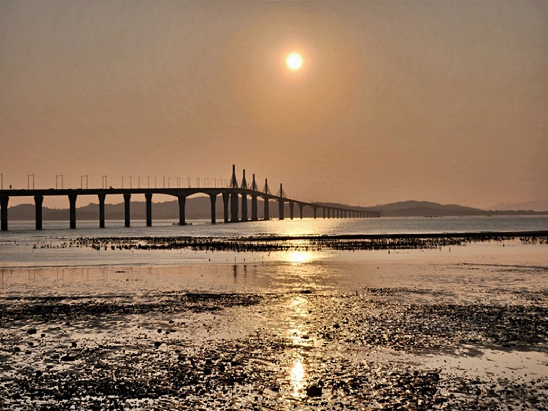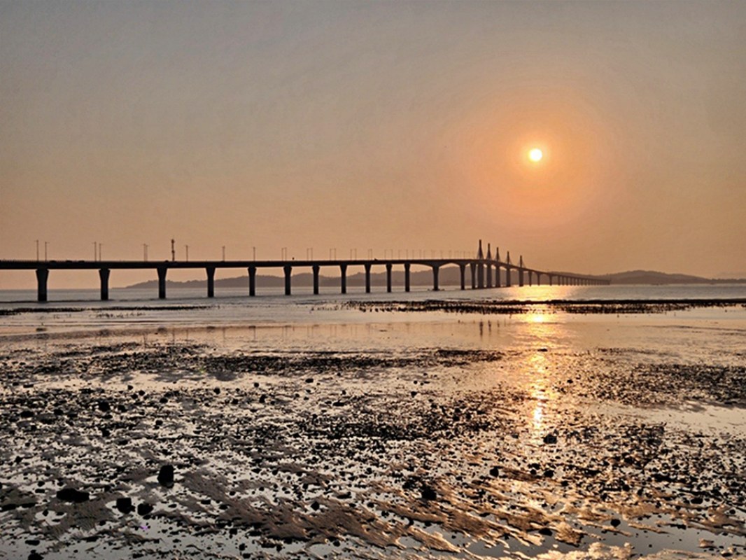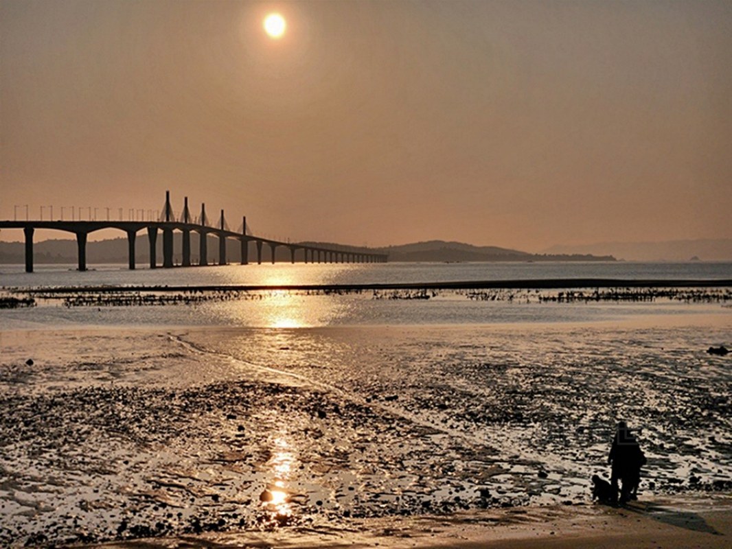 當太陽慢慢下降,灑落的光線映照在遠方橋墩和潮間帶,眼前閃著金色的光暈,美到讓人捨不得移開視線