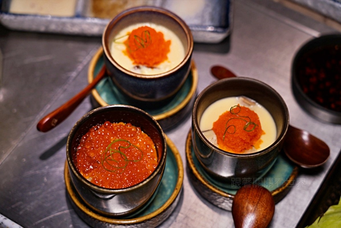 滑嫩細緻的蒸蛋,上面放了一大球飛魚卵,視覺很加分。往下挖還能吃到蛤蠣和小干貝,鮮味十足!也可以加價升級紅寶石鮭魚卵蒸蛋,滿滿的鮭魚卵光看就很療癒,入口那種爆漿海味,更是覺得超過癮