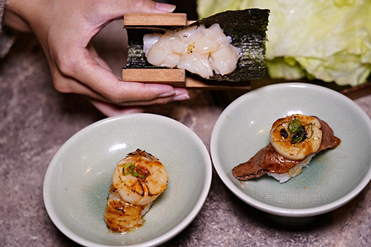 沒想到在燒肉店也能吃到這麼有水準的握壽司,三款干貝握壽司都很欠吃!炙燒比目魚鰭邊肉的油脂香氣十足,入口即化的口感搭配鮮甜干貝更有層次,炙燒牛肉疊上生鮮干貝,再點綴黑松露的香氣也非常邪惡