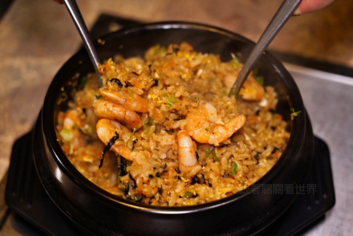米食我們選了蒜香蝦蝦拌飯,金黃色炒飯吸滿了爆香蝦膏的精華,再搭配鮮蝦、飛魚卵、蒜酥和海苔絲,配料給得很足!