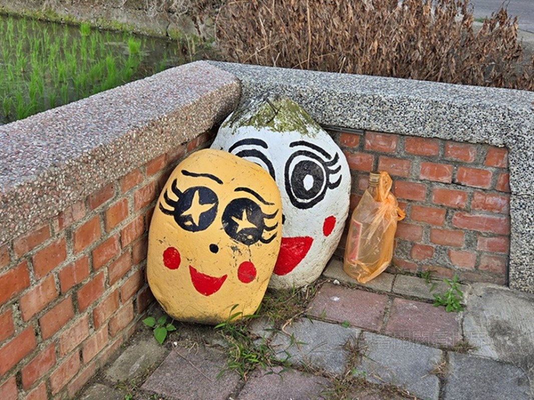 入口處有兩顆米娃娃造型石頭,大大的眼睛正對著路過的行人微笑,不過當天看到旁邊居然放了一瓶酒,有點疑惑是單純被丟棄的垃圾,還是這樣擺有什麼意義嗎?
