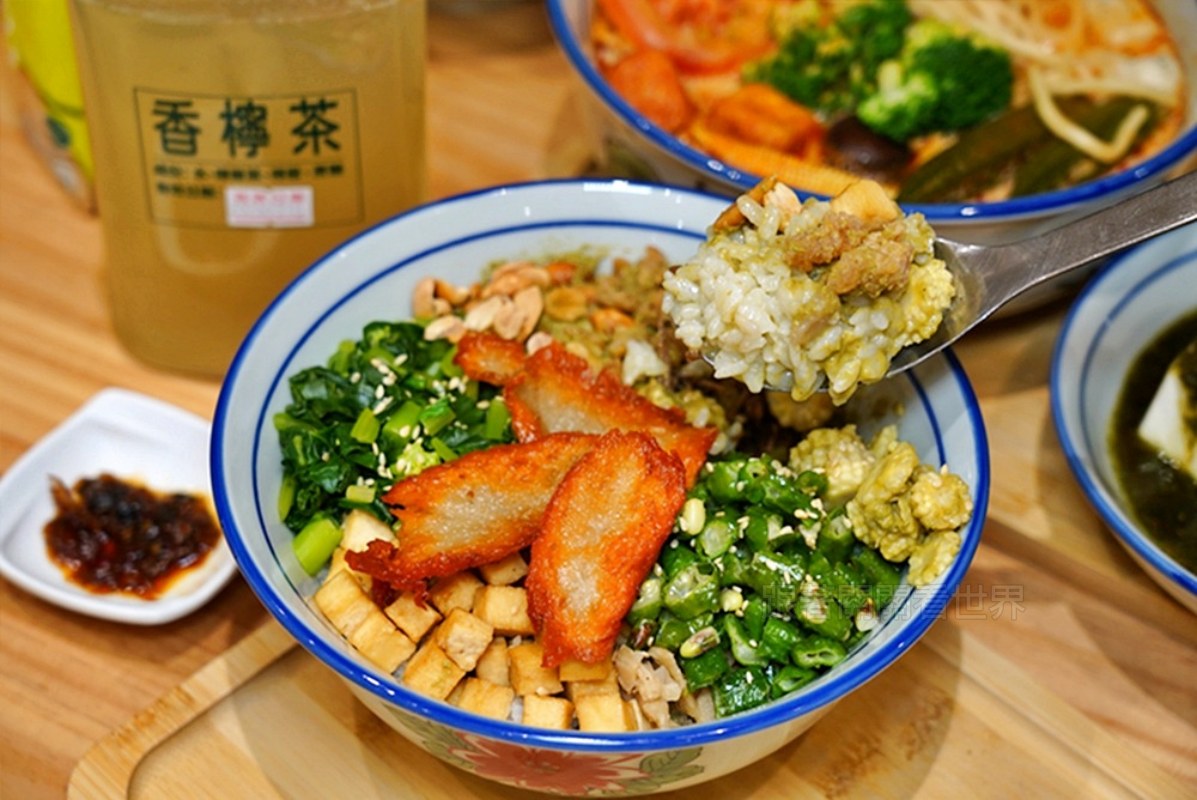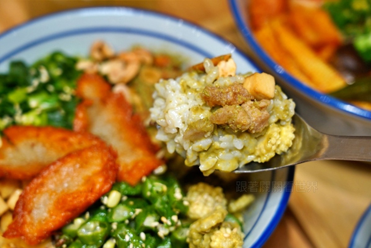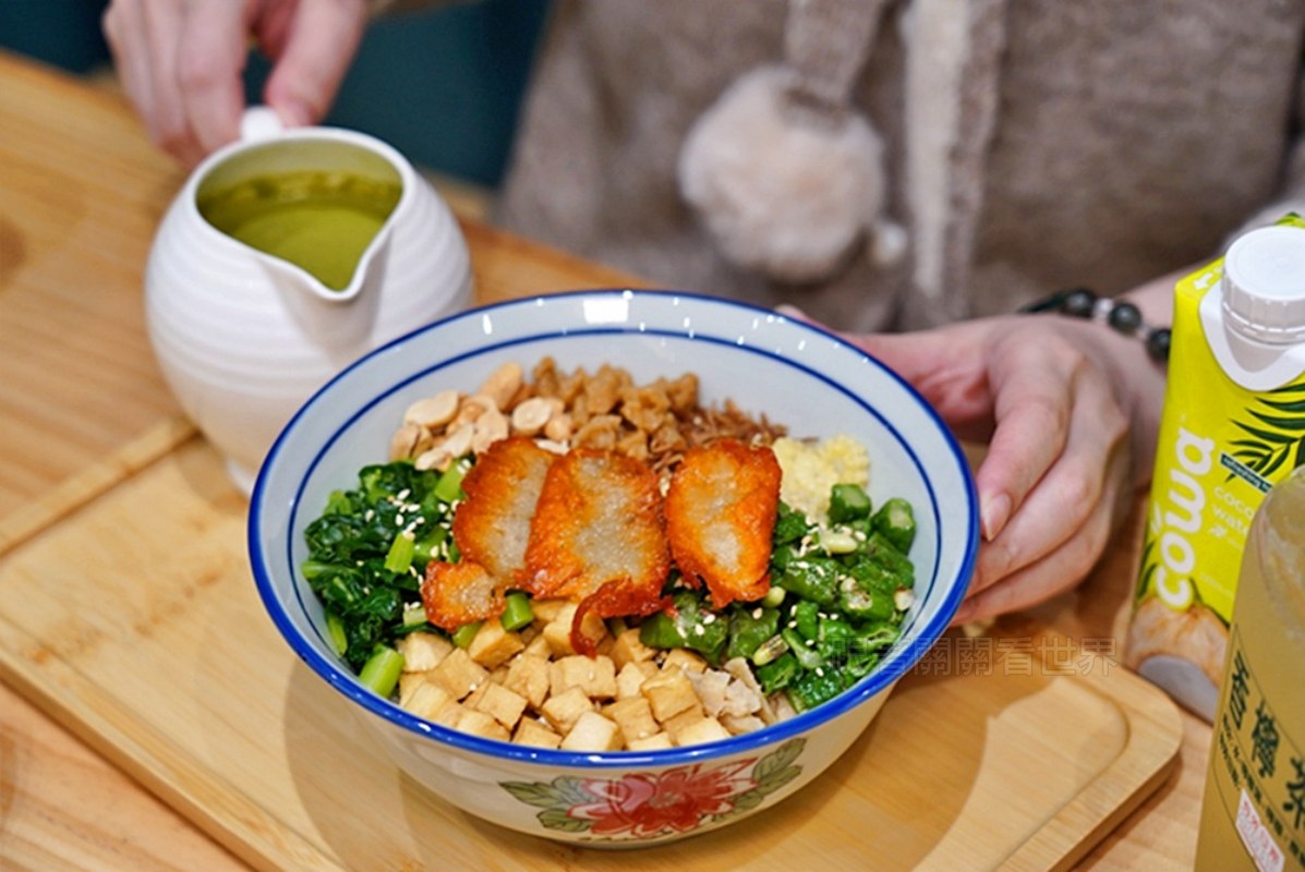 馬來鹹擂茶飯一端上桌,視覺上就誠意滿滿!除了招牌素叉燒,旁邊還鋪了豆乾、長豆丁、金針菇、花生、芥蘭菜和玉米筍等七種配菜,對於愛吃蔬菜的朋友來說,一定會覺得非常過癮