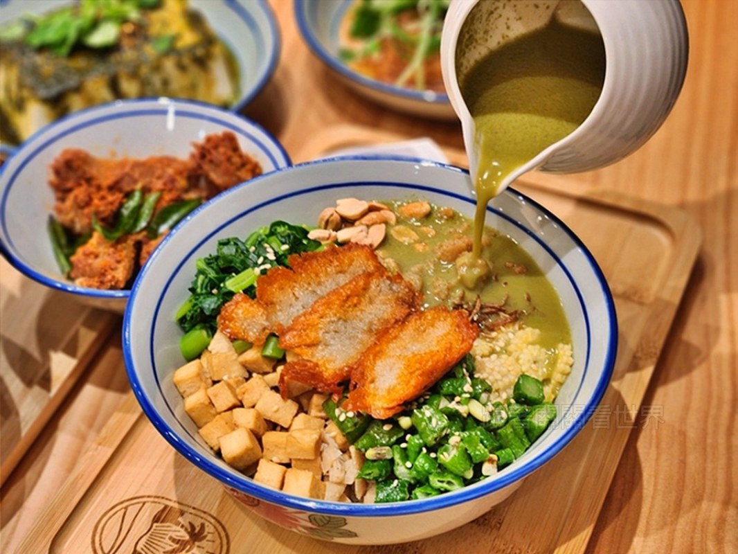 擂茶湯則是這道料理的靈魂,用多種綠色植物與堅果製成,加入七葉蘭後多了一股特別的香氣,質地是那種清爽的湯感!看著這壺翠綠茶湯緩緩倒在五顏六色的蔬菜飯上,真的很療癒