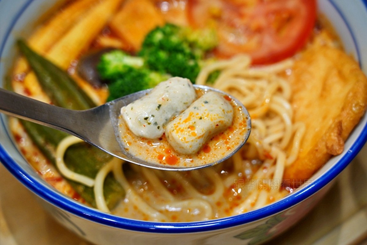 這碗泰泰椰香麵推薦給喜歡冬蔭功的朋友!橘紅色湯頭搭配滿滿蔬菜,顏色繽紛,看起來就很有食慾