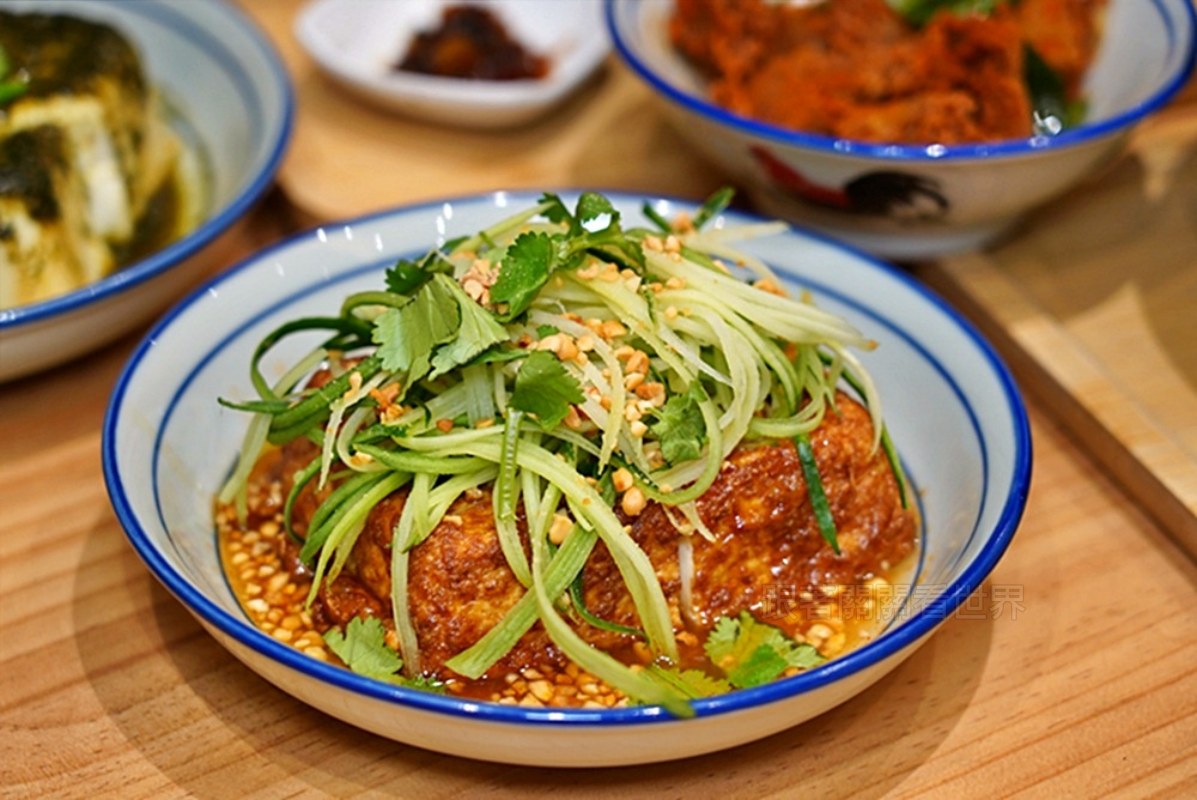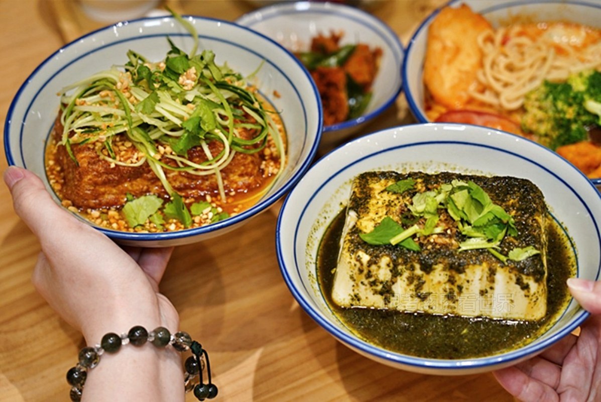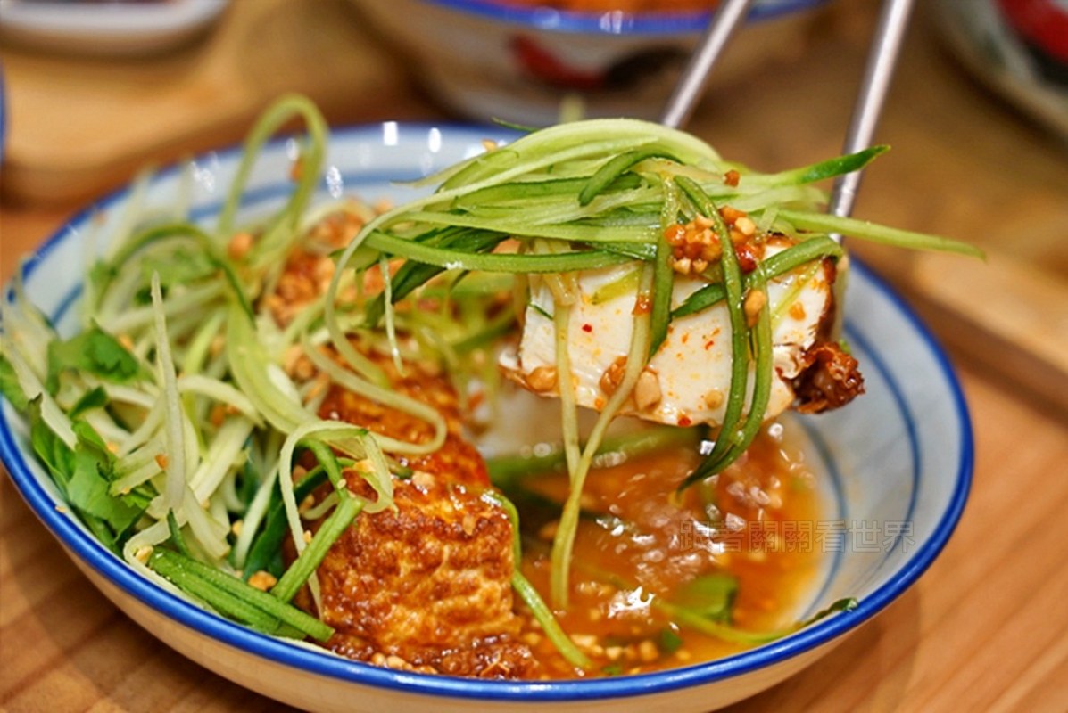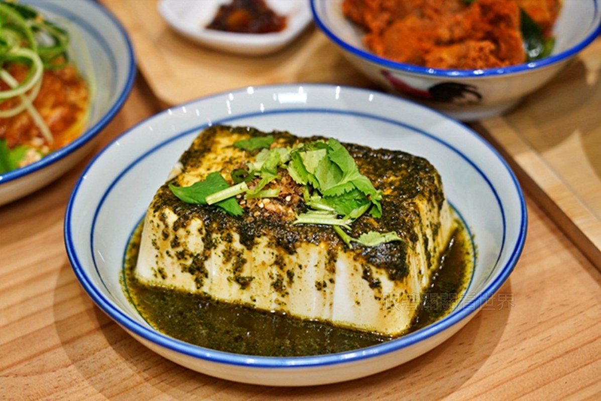 不吃辣的朋友就試試椿陽豆腐,同樣是整塊厚實的嫩豆腐,淋上店家自製香椿醬,那種獨特又濃郁的草本香氣很迷人,上頭還撒了素鬆和香菜提味!搭配冰冰涼涼的豆腐一起入口,吃起來相當爽口