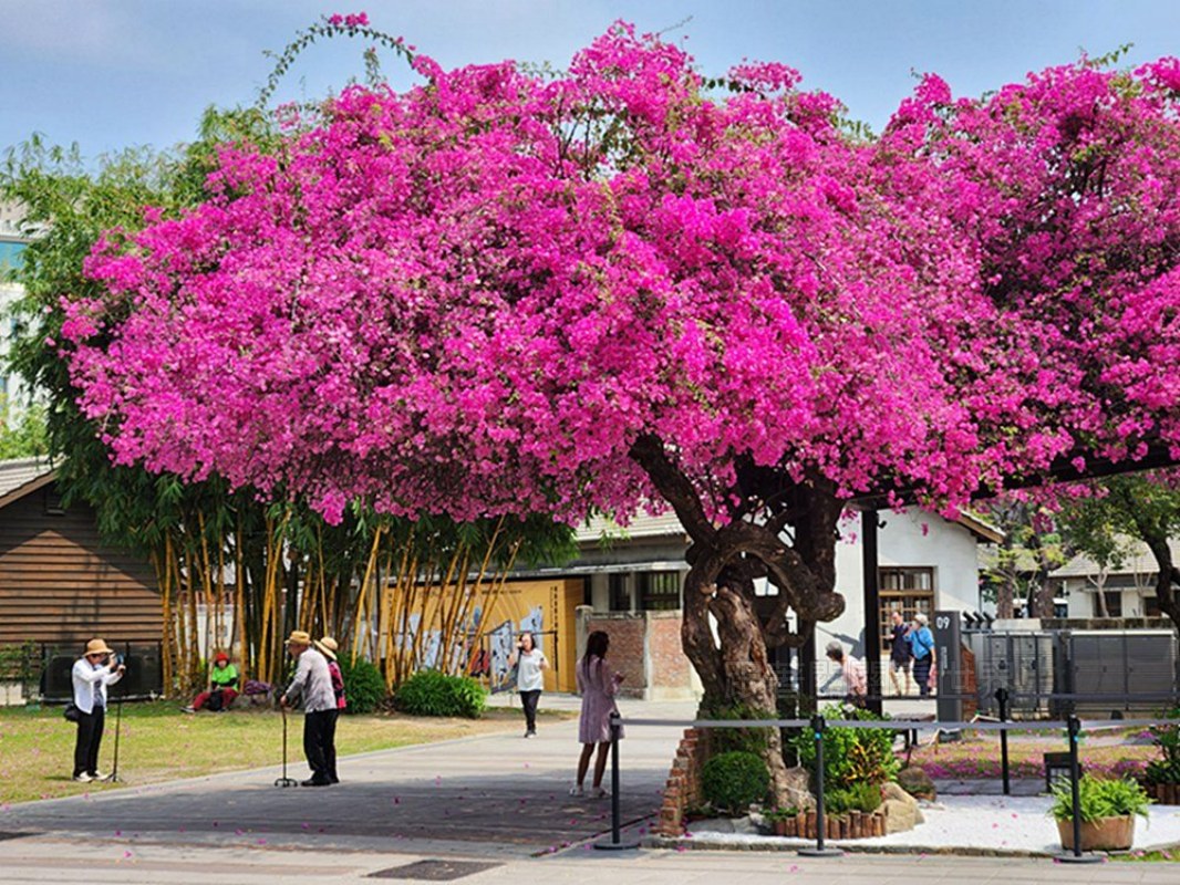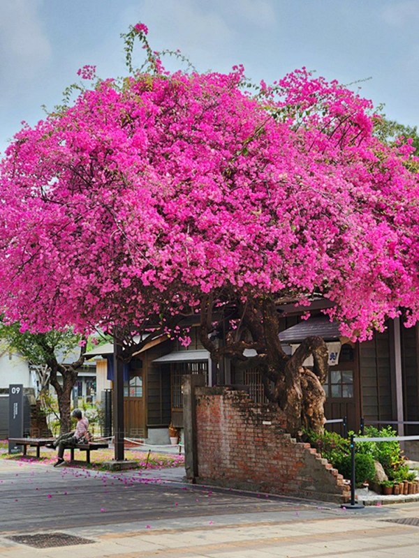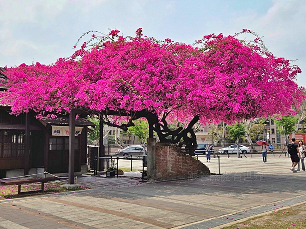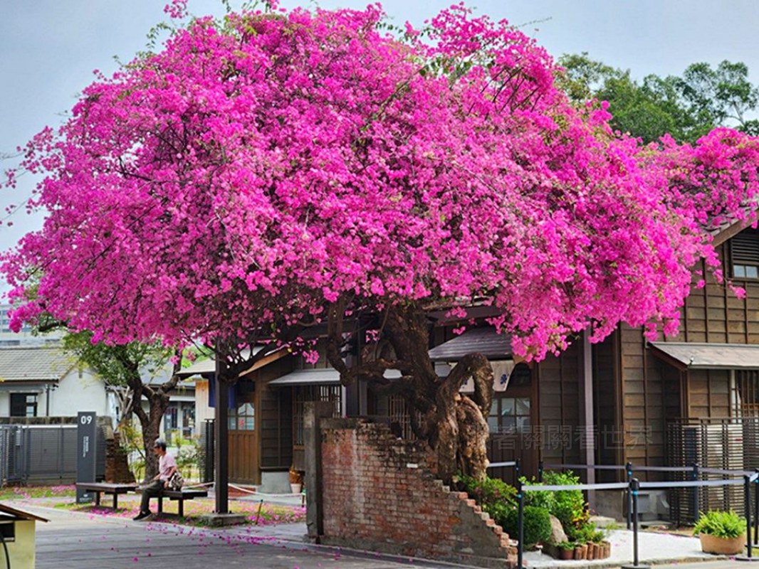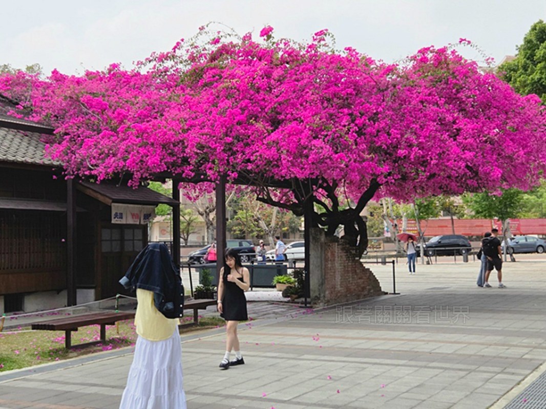 這棵九重葛的盛開期大約落在每年3~4月,最漂亮的時候,是整棵樹被花朵覆蓋,看起來就像一把巨大的粉紅花傘,錯過只能等明年啦!