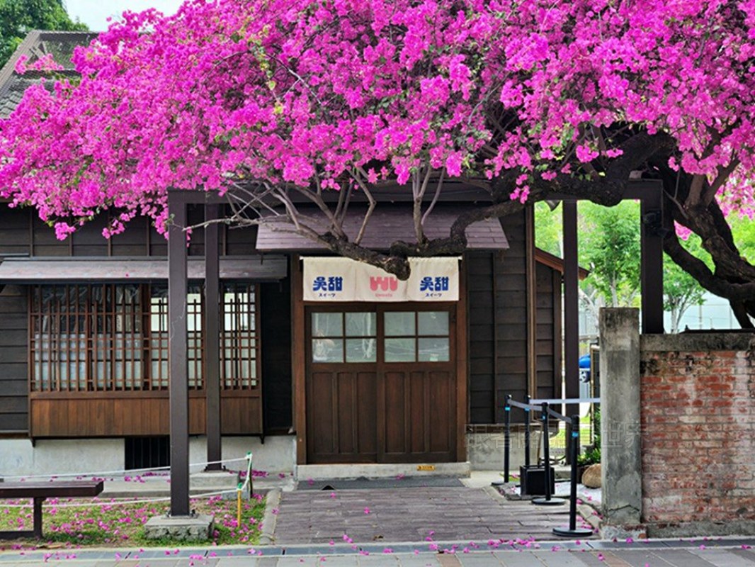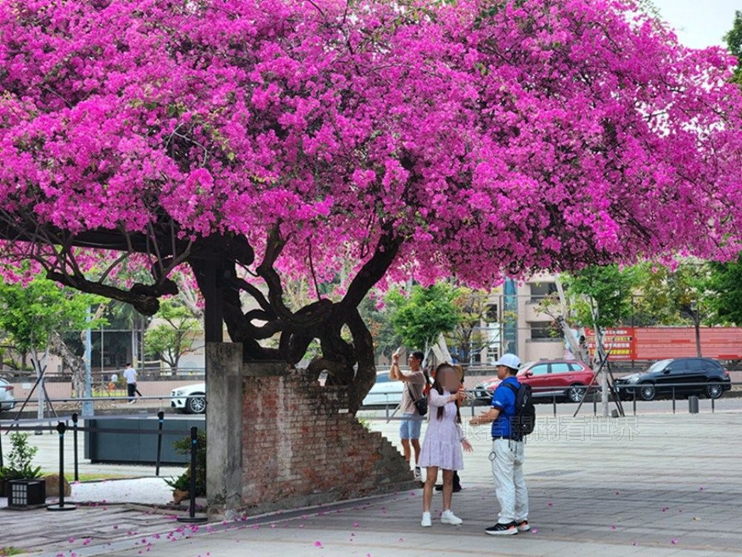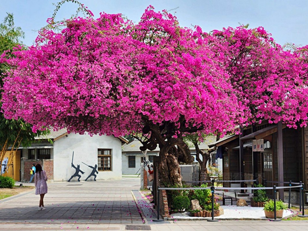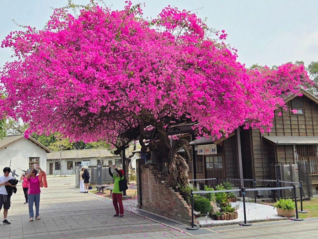 這棵九重葛的盛開期大約落在每年3~4月,最漂亮的時候,是整棵樹被花朵覆蓋,看起來就像一把巨大的粉紅花傘,錯過只能等明年啦!