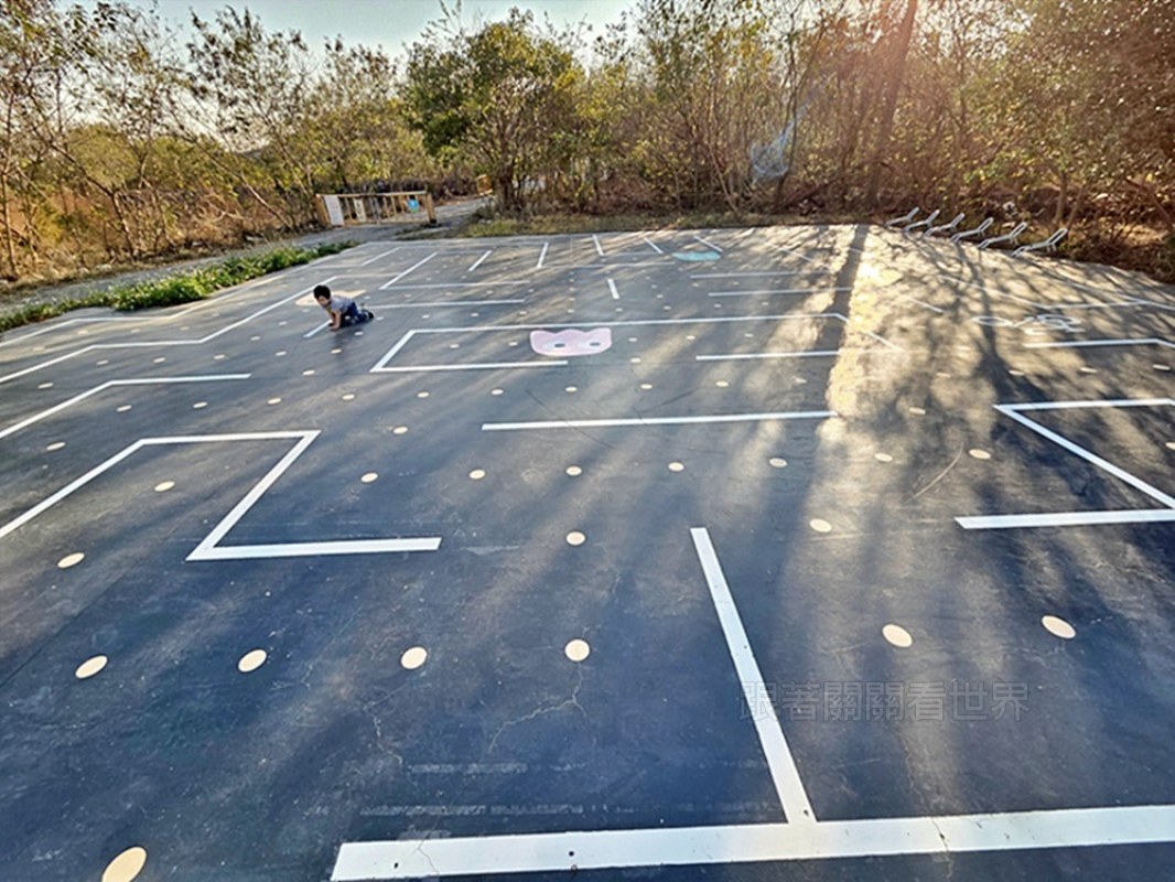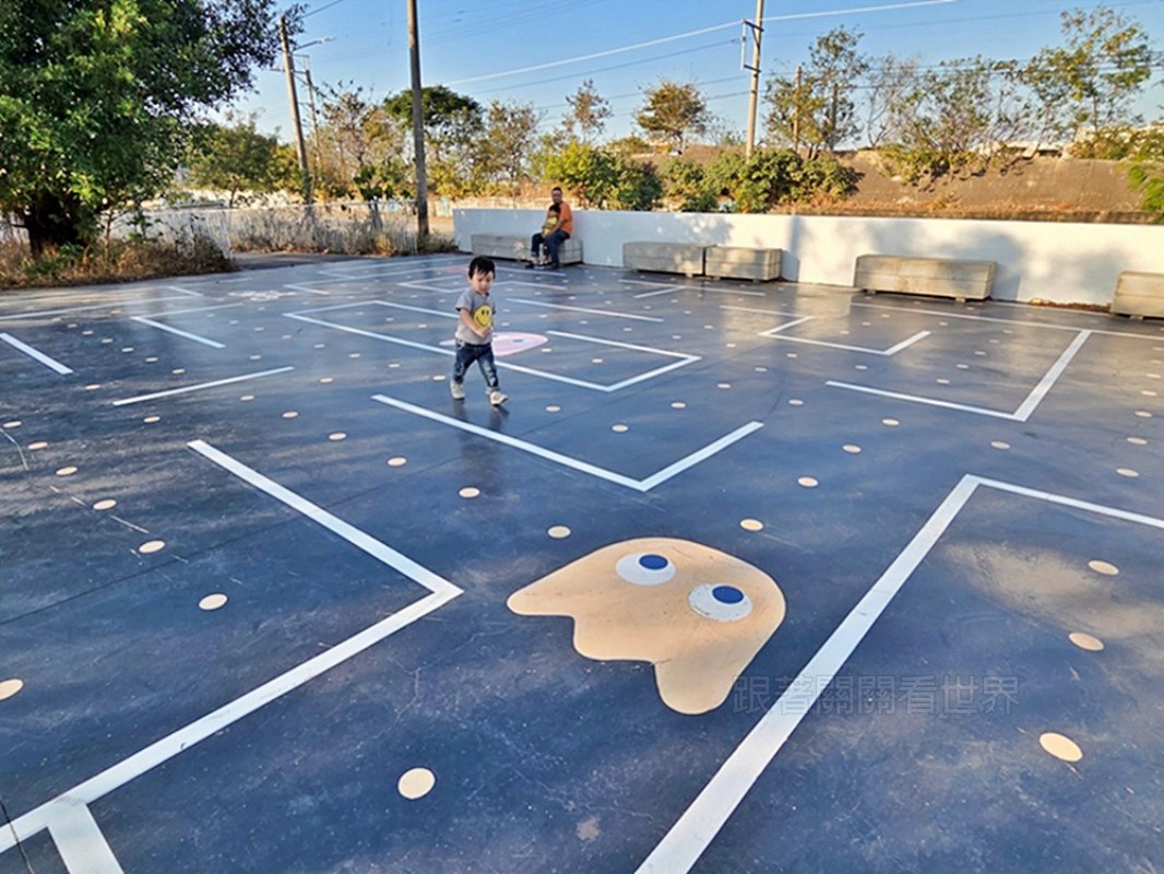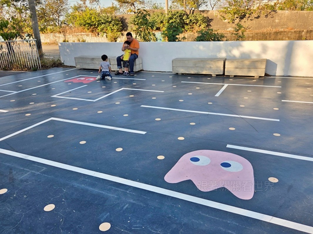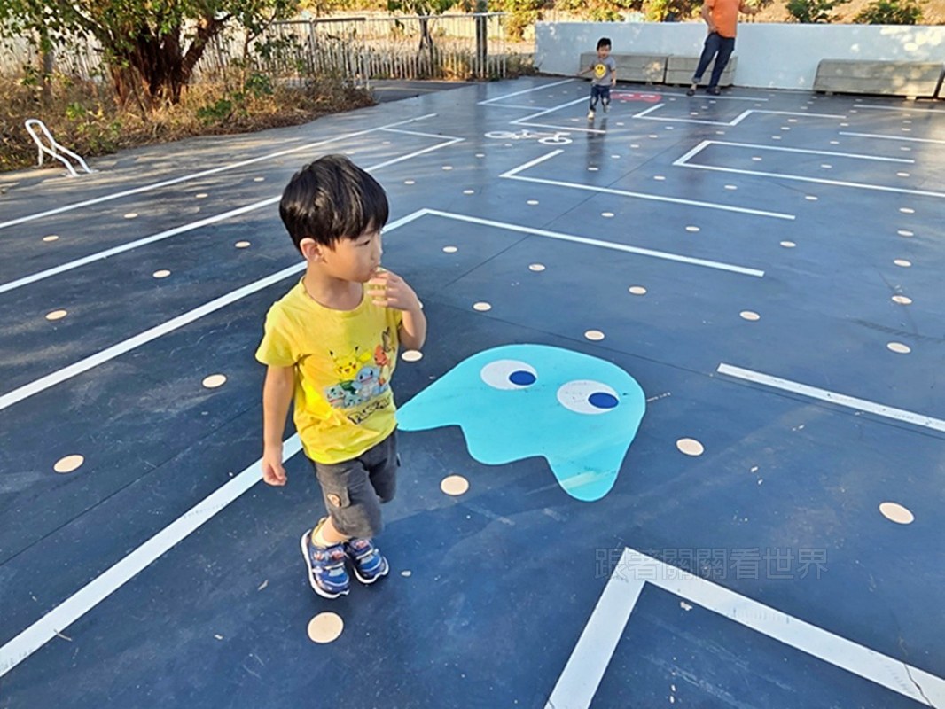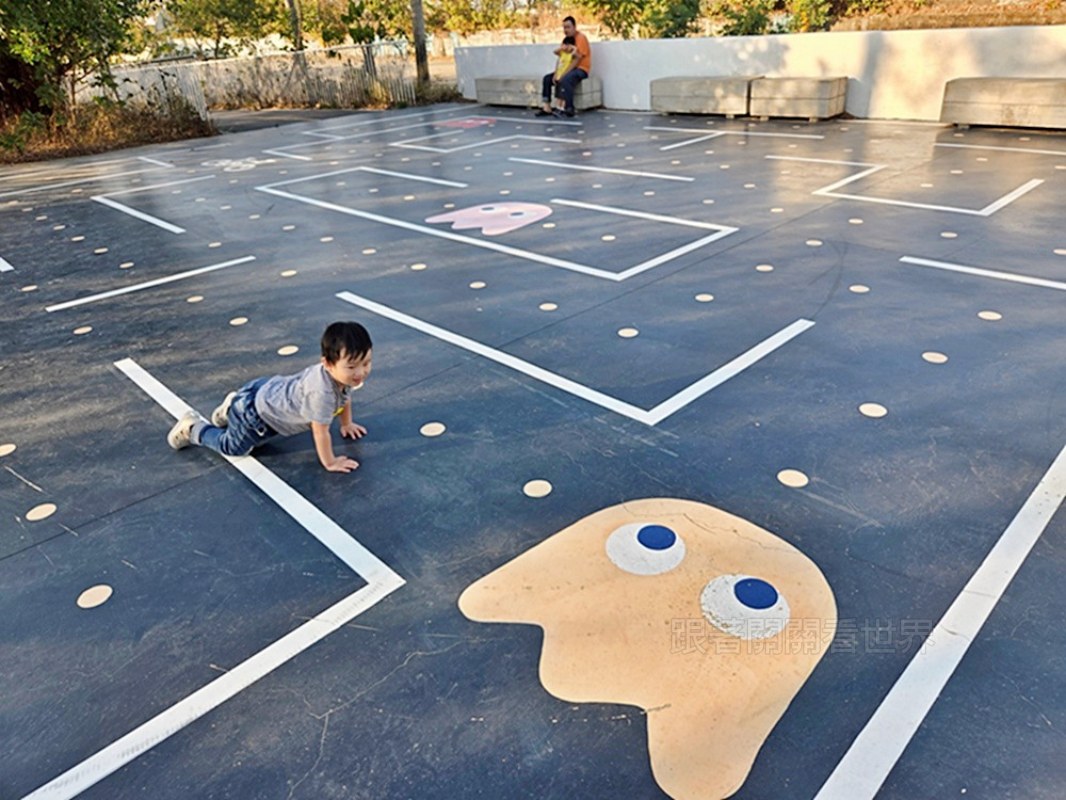 這座迷宮是以80年代經典電玩小精靈為設計靈感,地面完整還原迷宮路線與吃豆豆畫面,還能看到紅色、藍色、粉紅色、黃色幽靈,各自分散在不同角落