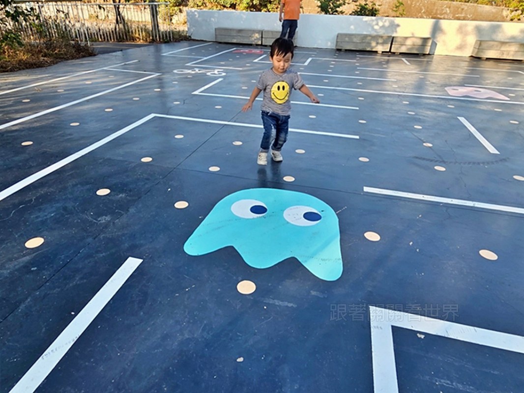 這座迷宮是以80年代經典電玩小精靈為設計靈感,地面完整還原迷宮路線與吃豆豆畫面,還能看到紅色、藍色、粉紅色、黃色幽靈,各自分散在不同角落