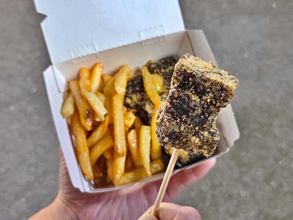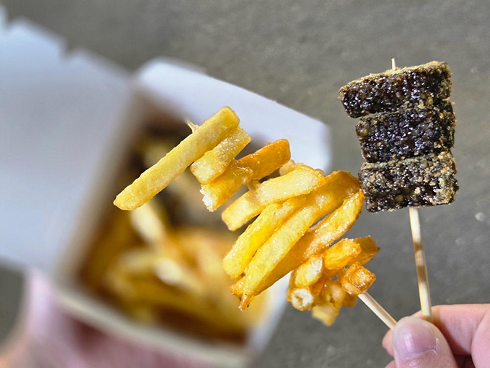 除了薯條和地瓜球,這攤看起來最獵奇的就是拔絲米血