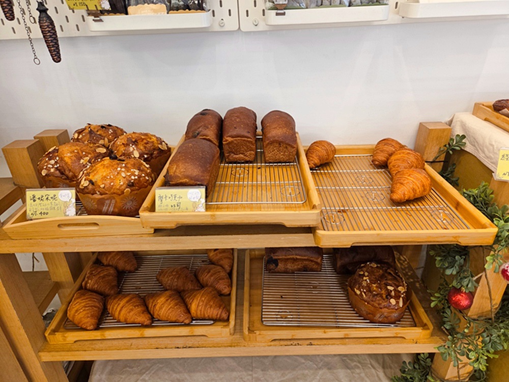 像是起司可頌、肉桂捲、酸種麵包、德國結、潘妮朵妮、吐司…等等,走的是精緻路線而非大量選項!也因為數量有限,熱門商品常常很快就被掃光,晚來大概只剩下空架了