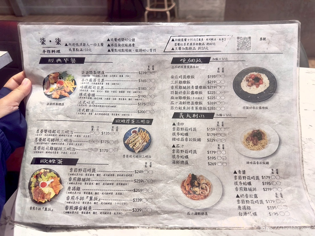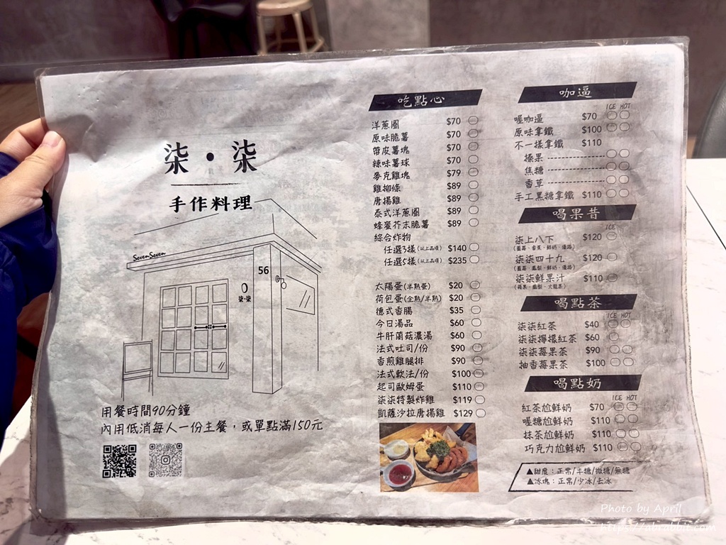 裡頭賣的以早午餐餐盤、歐姆蛋為主,也有賣義大利麵和燉飯,和一些單點的部分。選擇非常多,當天我們點了柒柒特製總匯、香煎雞排歐姆蛋的早午餐,都很不賴呢。