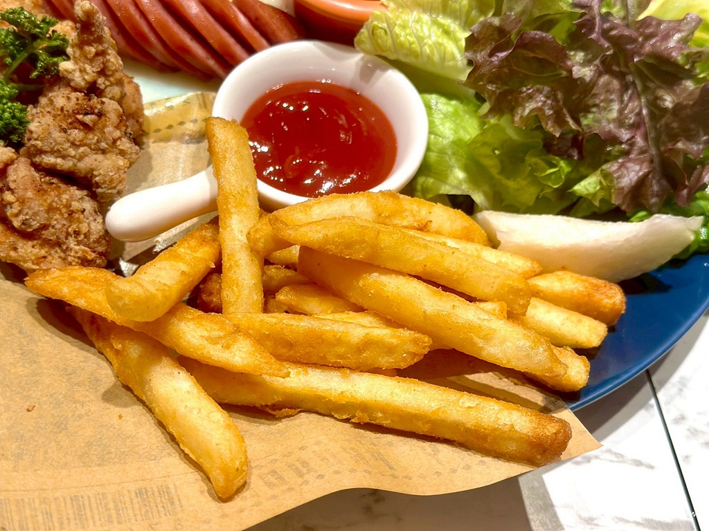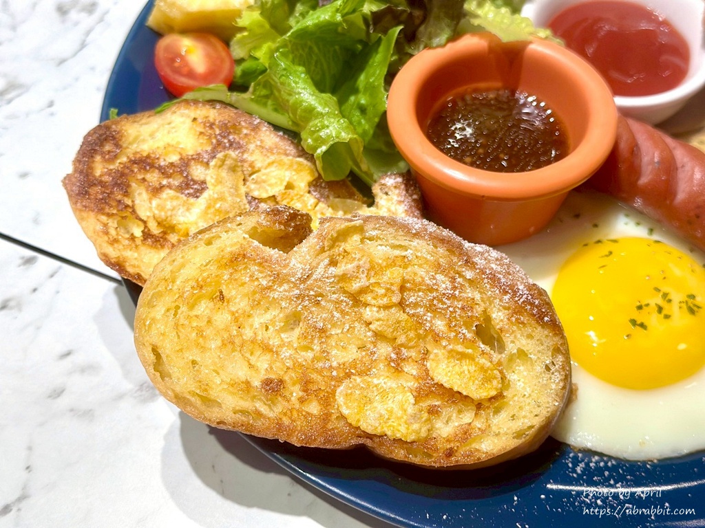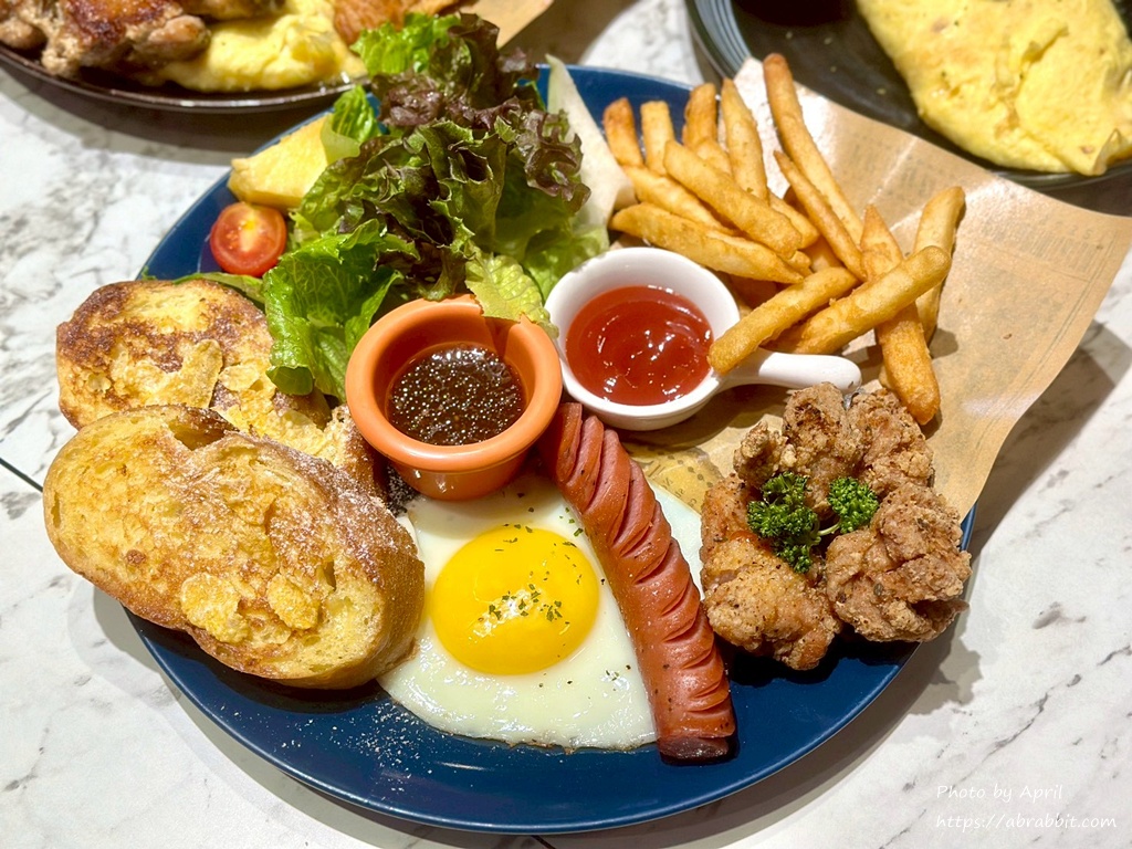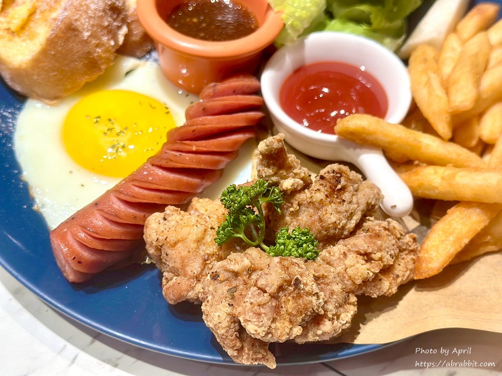 這道總匯是友人點的,是店內人氣組合,盤子裡頭超豐富唷,有炸雞、德式香腸、法式吐司、沙拉與脆薯和一顆太陽蛋,色彩鮮明擺盤也好看。