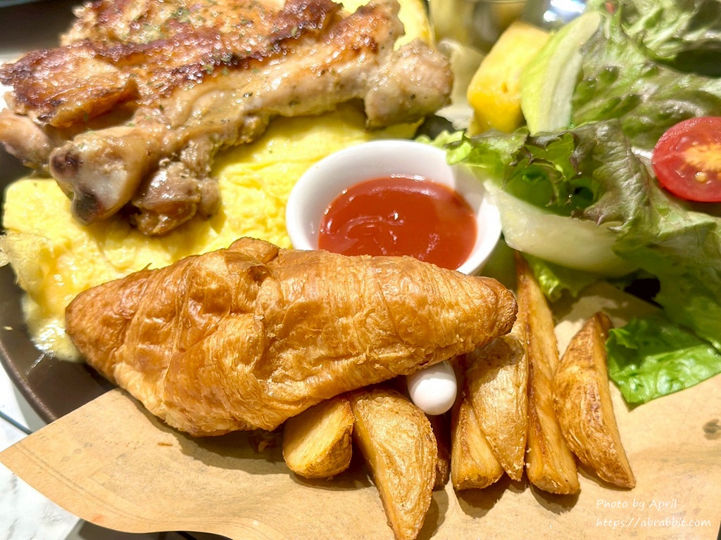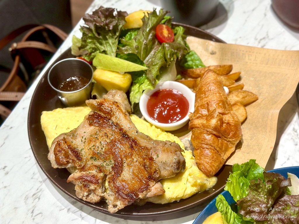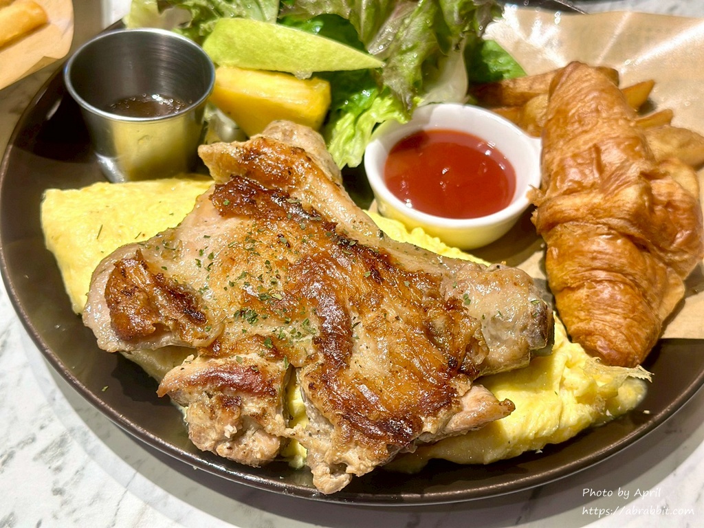 另外這個是我點的香煎雞排歐姆蛋,裡頭配上的是帶皮薯條、可頌、沙拉,歐姆蛋在雞排下方,整個餐盤份量也是很有飽足感的啦!