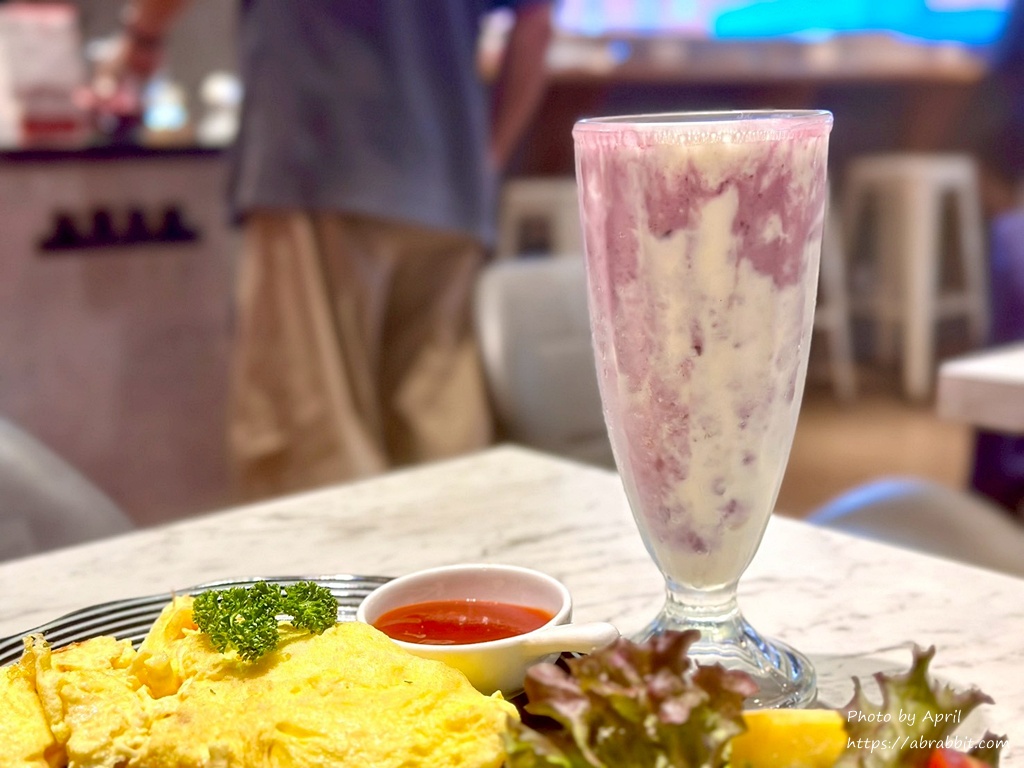 另外我們還點了一份果昔,裡頭是加了藍莓、香蕉、鮮奶和優格,名稱很可愛:柒上八下,顏色看起來也超美!